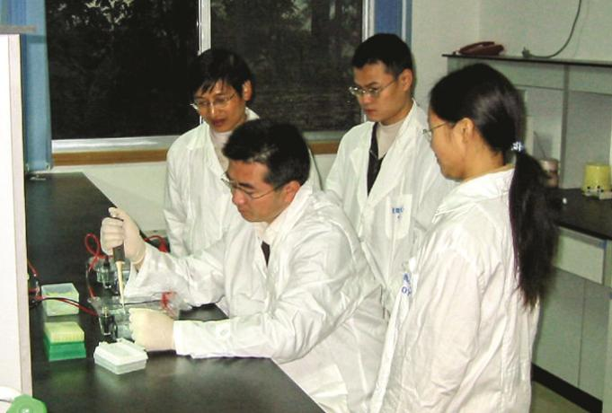 周常勇在實驗室指導學生,中間實驗者為周常勇
