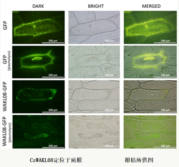 植物細胞壁關(guān)聯(lián)的類受體激酶WAKL在植物對病原菌侵染的響應(yīng)過程中起重要作用。病原菌侵染時,該酶可以識別細胞壁成分的變化,并將侵染信號通過跨膜結(jié)構(gòu)域傳遞至細胞內(nèi)的磷酸激酶結(jié)構(gòu)域,通過對靶蛋白的磷酸化作用調(diào)節(jié)下游抗病相關(guān)基因或信號通路,引發(fā)植物抗病反應(yīng)。不過,此前在柑橘研究中尚無利用WAKL提高柑橘對潰瘍病抗性的報道。