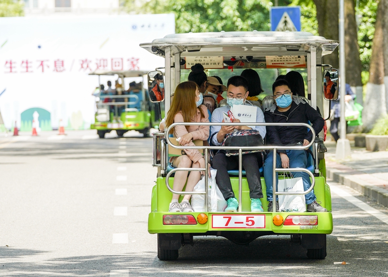 5月15日,在西南大學校園內,學生們搭乘校內轉運車前往各自的宿舍。