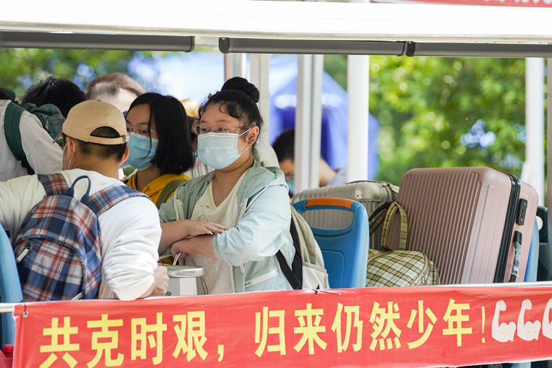 5月15日,在西南大學的返校學生專用通道前,學生按照工作人員和志愿者的引導有序進入校區。