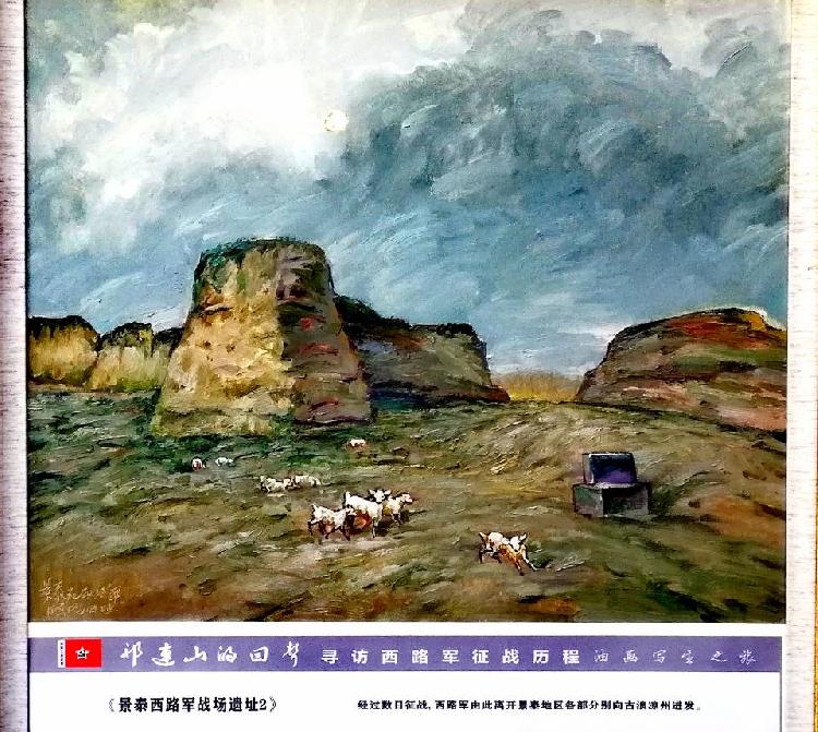 其中,“景泰縣西路軍戰場遺址”組作最為動人心魄,共3幅作品。1936年11月,接到中央革命軍事委員會命令,紅軍在景泰縣浴血奮戰16天,進行了尾泉、一條山等戰役十多次,取得了“大拉牌大捷”,為西路軍在景泰的組成奠定了堅實基礎。