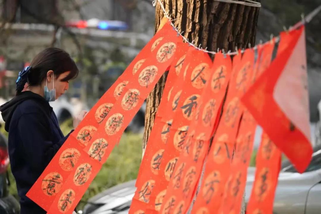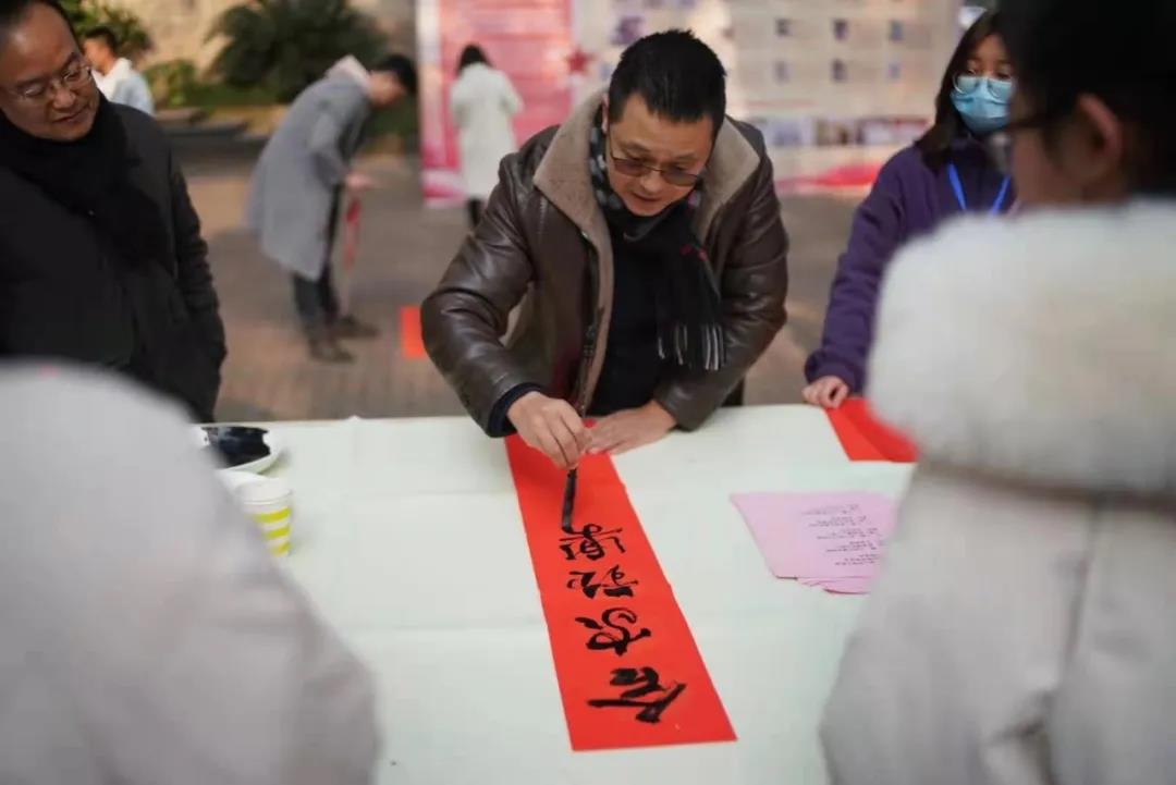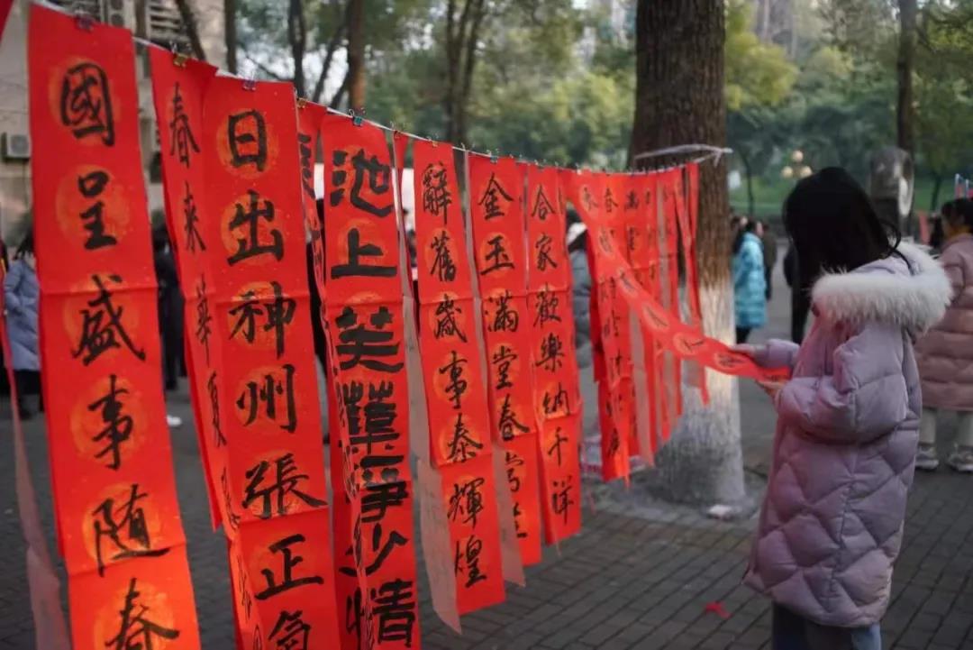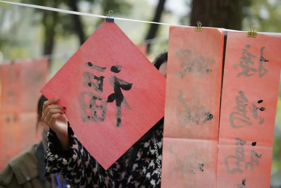 在學校樟樹林廣場,有美術學院的多名教授、研究生正在在大紅春聯紙上進行創作。據了解,今日全校共有20名師生參與創作對聯,共計千余副。許多領取到春聯的學生都表示,十分的欣喜,“不僅是藝術品,也是來自新年的祝福。”學生們紛紛表示。