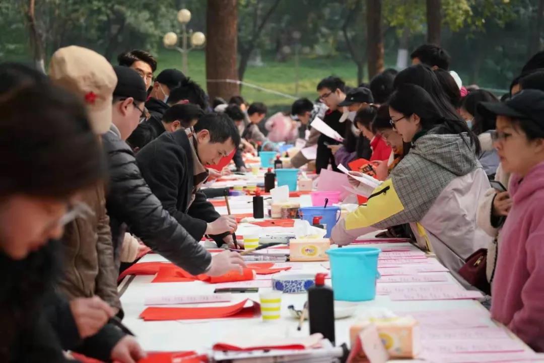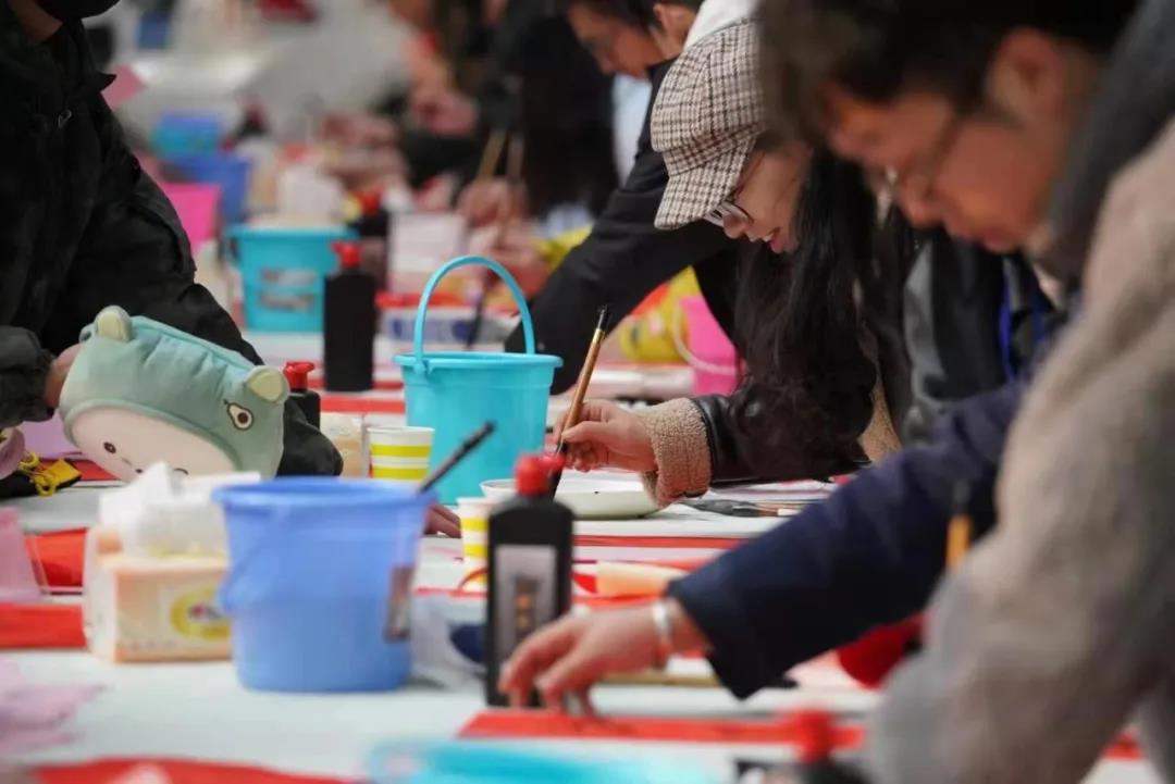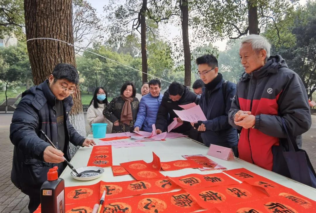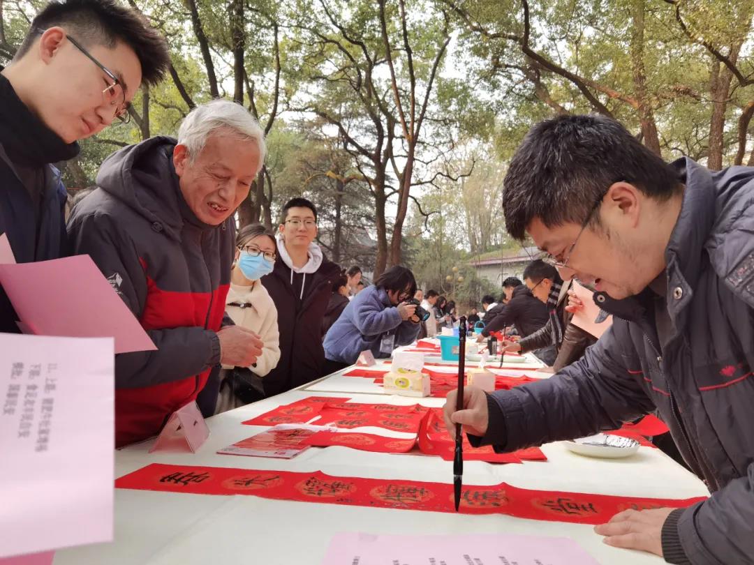在學校樟樹林廣場,有美術學院的多名教授、研究生正在在大紅春聯紙上進行創作。據了解,今日全校共有20名師生參與創作對聯,共計千余副。許多領取到春聯的學生都表示,十分的欣喜,“不僅是藝術品,也是來自新年的祝福。”學生們紛紛表示。
