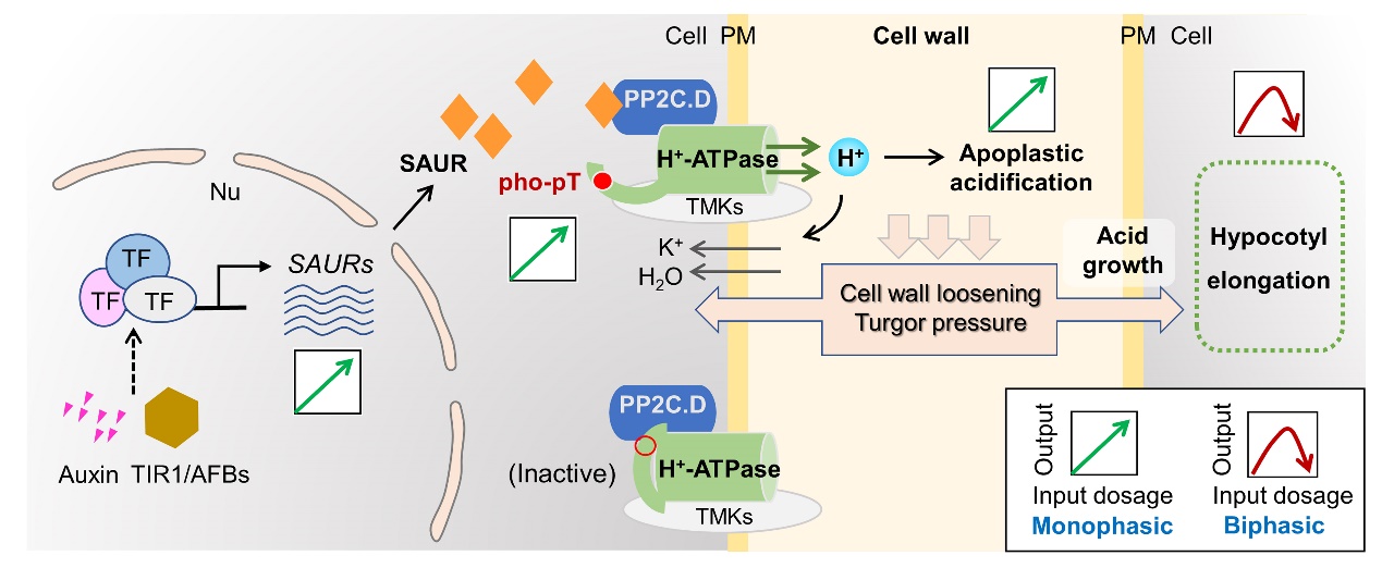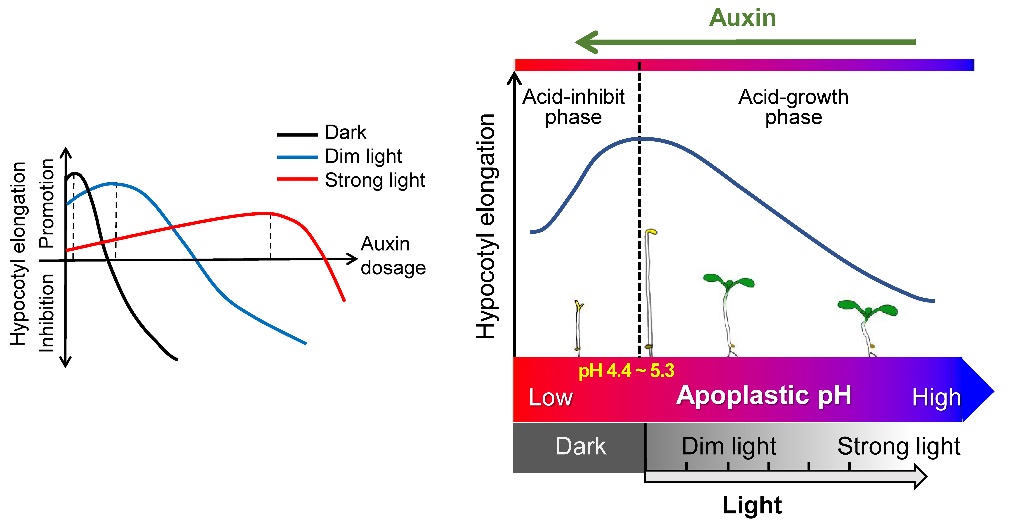該研究發(fā)現(xiàn),生長素以劑量依賴的方式誘導(dǎo)SAUR家族基因表達(dá)。隨著生長素劑量的增加,SAUR家族蛋白水平逐漸積累,促使質(zhì)膜質(zhì)子泵H+-ATPase活性被逐漸激活,質(zhì)子持續(xù)外流,進(jìn)而促使下胚軸表皮細(xì)胞質(zhì)外體被逐漸酸化。根據(jù)酸生長理論,質(zhì)外體適度酸化促進(jìn)細(xì)胞延展,而該研究發(fā)現(xiàn)當(dāng)質(zhì)外體酸化到一定程度則抑制細(xì)胞延展。因此,生長素的雙重效應(yīng)取決于細(xì)胞對質(zhì)外體酸化程度(pH)的響應(yīng),且發(fā)生在生長素介導(dǎo)的轉(zhuǎn)錄重編程之后。光信號促使下胚軸表皮細(xì)胞質(zhì)外體pH升高,抵消生長素誘導(dǎo)的質(zhì)外體的過度酸化,使得生長素在光下促進(jìn)下胚軸伸長。