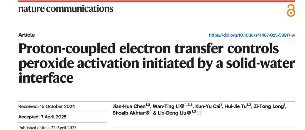 4月22日,國際著名期刊《自然通訊》(Nature Communications)在線發(fā)表了學校資源環(huán)境學院劉琳東副教授的研究論文《質子耦合的電子轉移控制固水界面引發(fā)的過氧化物活化》(Proton-coupled electron transfer controls peroxide activation initiated by a solid-water interface)。該研究首次證實了質子與電子在固-水界面氧化反應中的協同作用機制,為高級氧化技術發(fā)展提供了新理論依據,并為開發(fā)高效、低能耗的分散式水處理技術提供了重要理論框架。