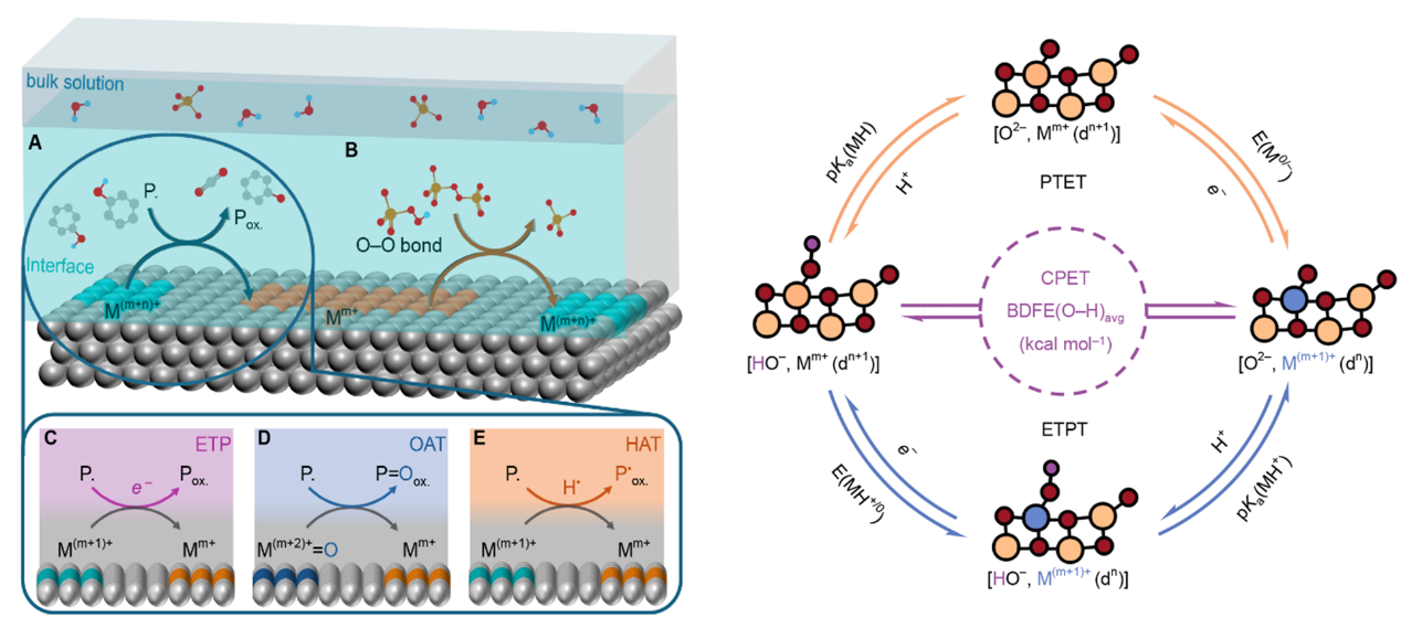 分散式水處理技術因其在成本和節(jié)能方面優(yōu)于傳統的集中式系統而日益受到重視?;谶^氧化物的分散式高級氧化工藝雖具潛力,但其反應機制長期被認為由單一電子轉移驅動。該研究通過原位定量實驗與熱力學分析,揭示了在典型過渡金屬氧化物催化的過氧化物活化過程中,質子與電子以1:1的嚴格比例耦合轉移,形成高活性金屬(氧)中間體,顯著提升污染物氧化效率。這一發(fā)現突破了傳統認知,首次從實驗和熱力學角度證實了質子-電子耦合轉移在固-液界面的核心作用。