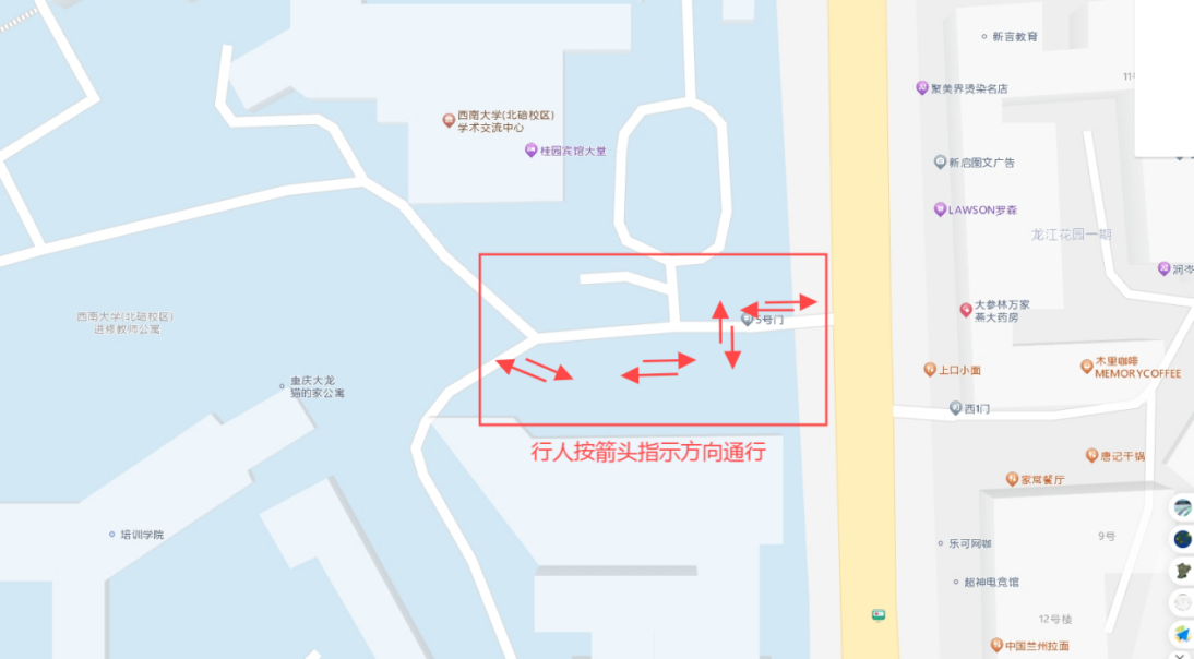 請(qǐng)廣大師生車輛繞道行駛,五號(hào)門僅供行人通行(如圖所示)。由此帶來的不便,敬請(qǐng)諒解!