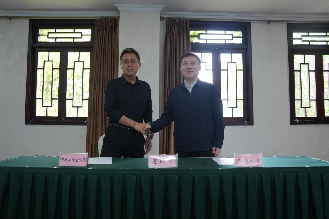 與會(huì)人員圍繞進(jìn)一步推進(jìn)貫通式人才培養(yǎng)、學(xué)科聯(lián)合攻關(guān)、儀器平臺(tái)開(kāi)放、人才隊(duì)伍互訪等方面展開(kāi)了深入探討。中國(guó)科學(xué)院微生物研究所副所長(zhǎng)王琳淇與范大明代表雙方簽訂了研究生聯(lián)合培養(yǎng)協(xié)議。