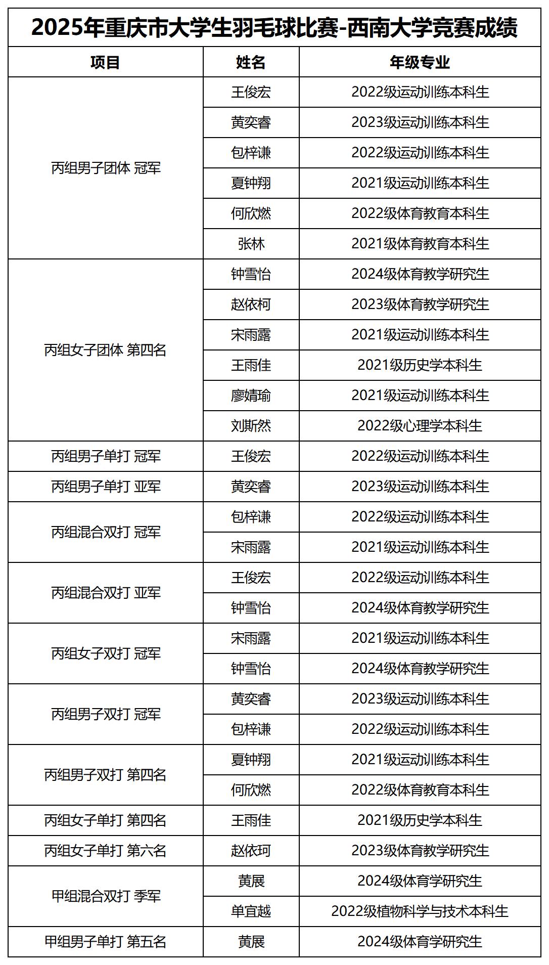 據悉,本次比賽由重慶市教育委員會主辦,重慶大學承辦,吸引了全市56所高校,共726名運動員、領隊、教練員積極參與,參賽規模創歷史新高。比賽設甲、乙、丙三組,甲組為本科院校普通學生,乙組為高職高專院校普通學生,丙組為體育專業學生,共決出各組別男單、女單、男雙、女雙、混雙和丙組男、女團體等17項冠軍。