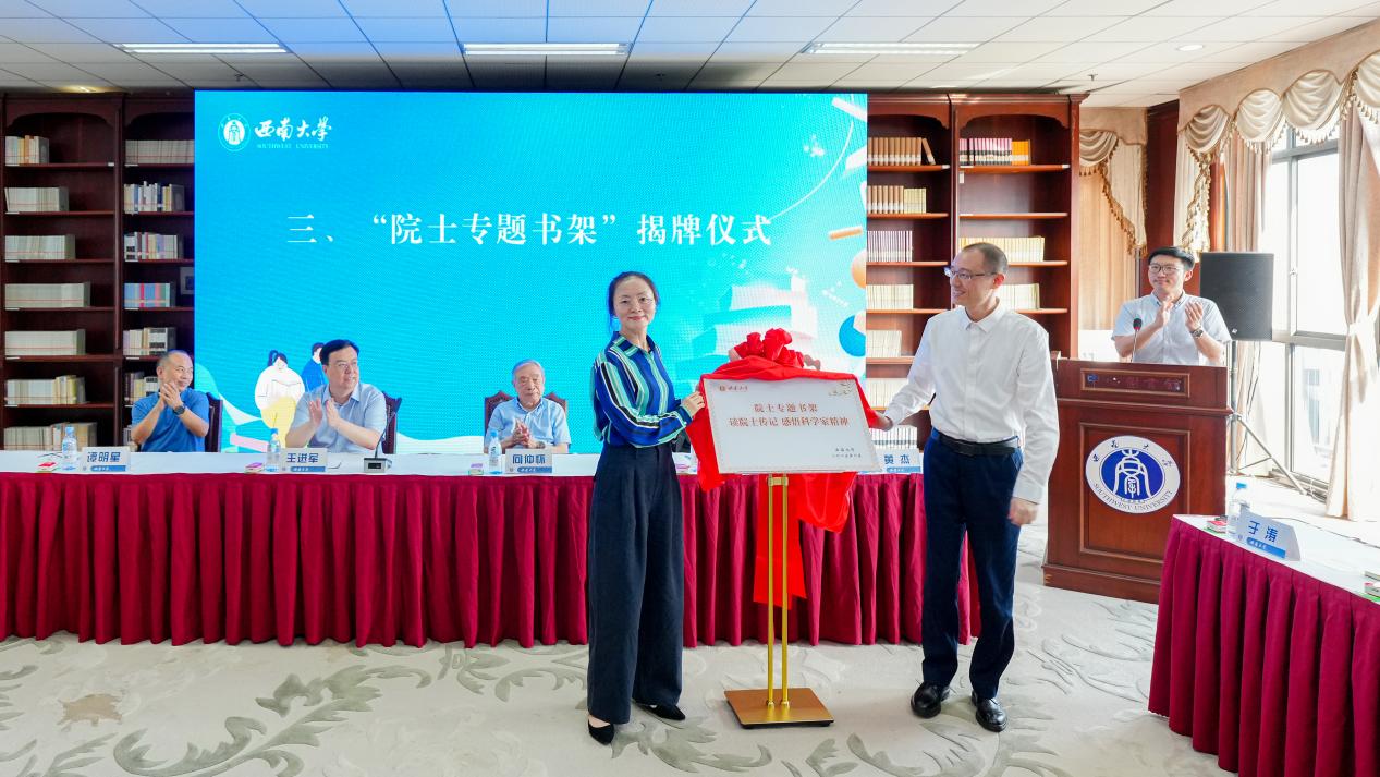 隨后,圖書館館長涂濤詳細介紹了圖書館“院士專題書架”設立的背景與意義。唐海英與黃杰共同為《院士傳記》專題書架揭牌。