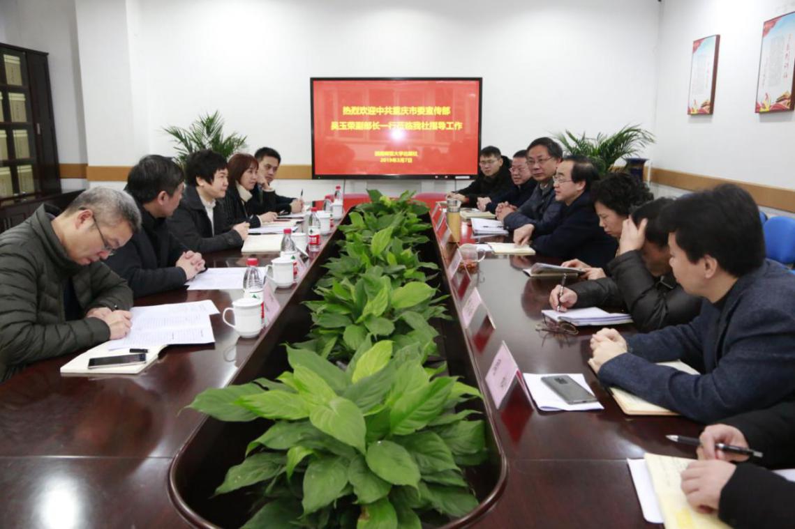 在調研座談會上,潘書記代表學校對吳部長一行表示熱烈歡迎,感謝市委宣傳部長期以來對學校以及出版社工作的大力關心、支持和幫助,向吳部長介紹了西南大學的歷史沿革、學生培養、學科建設、教學科研、校園特色等基本情況。