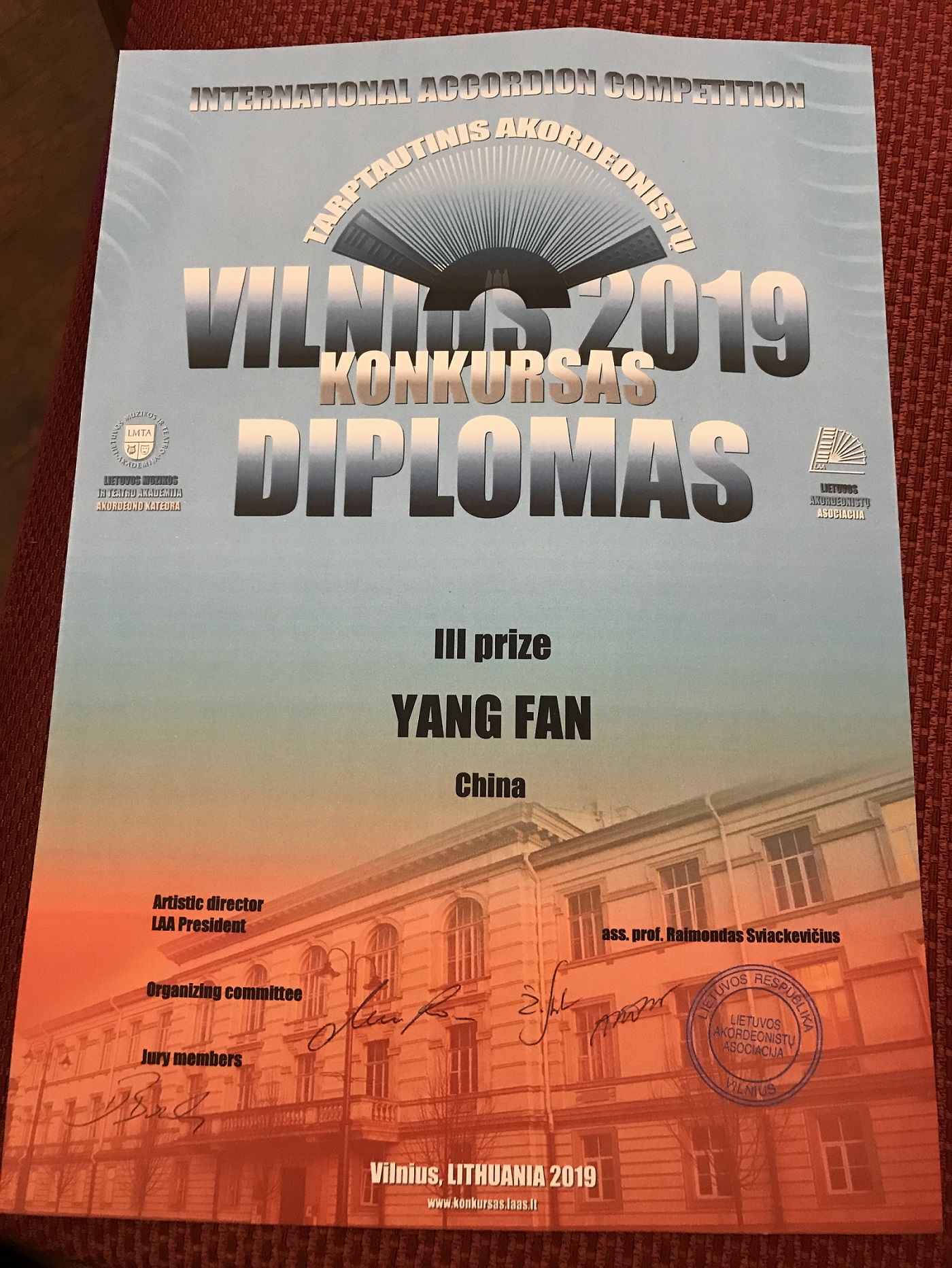 范洋在2019立陶宛維爾紐斯國際手風琴比賽中獲獎