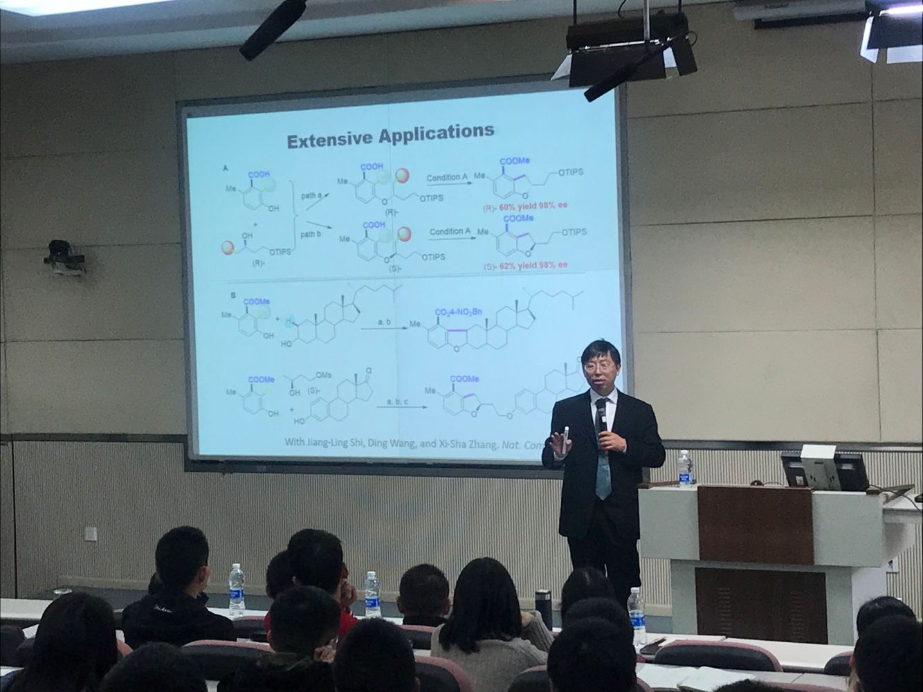 黃承志教授對施章杰教授表示熱烈歡迎,簡要介紹了施章杰教授的學術研究相關情況:施章杰教授曾獲杰出青年基金,獲聘教育部“長江”特聘教授和科技部“973”項目首席科學家,并入選國家“萬人計劃”;曾獲國家自然科學二等獎等多項榮譽和獎項;主要從事惰性化學鍵和小分子活化研究,在C?H/C?O/C?C鍵活化等研究領域做出了系統(tǒng)性貢獻。