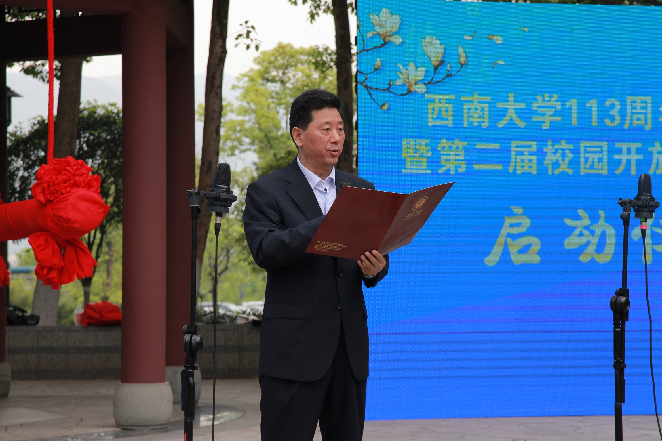西南大學副校長靳玉樂主持啟動儀式。靳校長介紹,此次活動旨在敞開懷抱,向新老朋友充分展示西南大學在辦學條件、學科特色、師資力量、人才培養等方面的發展成就,弘揚西南大學“含弘光大,繼往開來”之校訓、“特立西南,學行天下”之大學精神,曬出西南大學這所百年學府傳統悠久的歷史文化和風光旖旎的校園春景。