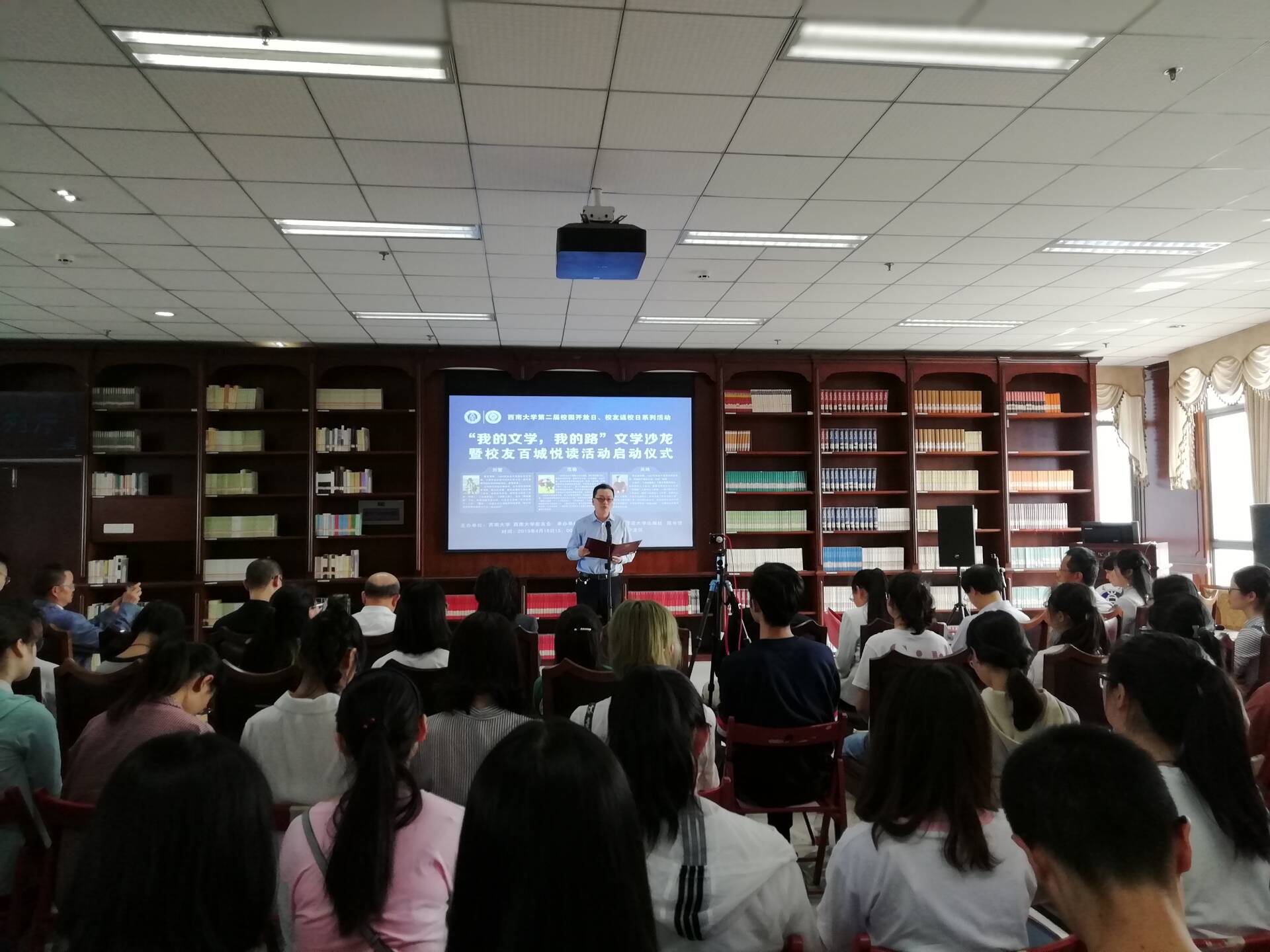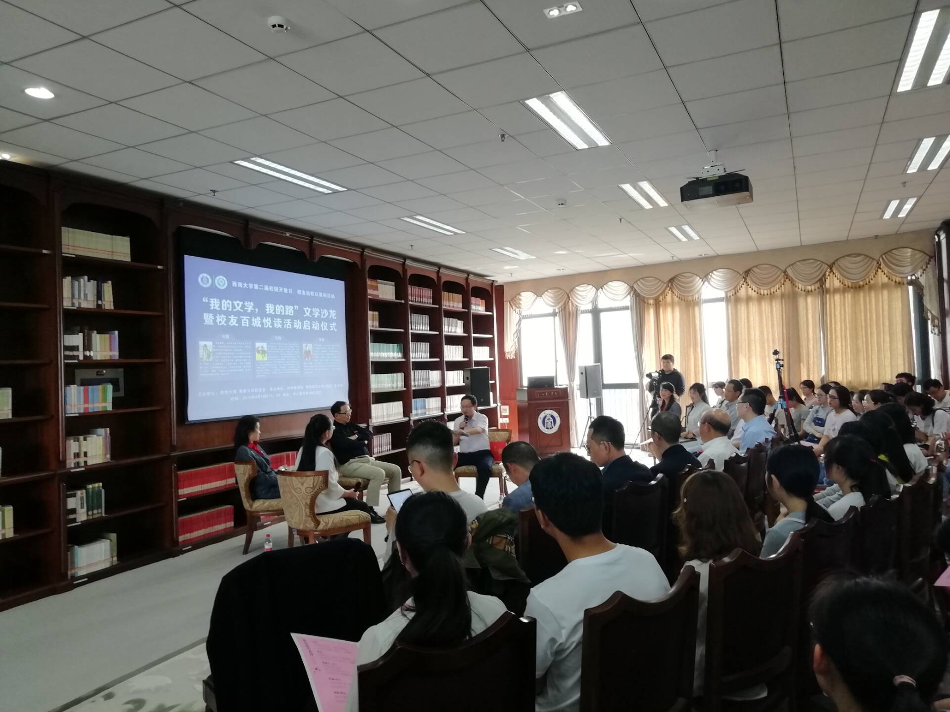 4月18日,學校第二屆校友返校日系列活動之“我的文學我的路”校友文化沙龍暨校友百城悅·讀活動啟動儀式在中心圖書館舉行。副校長溫濤、對外聯絡部部長龔常智、文學院黨委書記黃杰、圖書館副館長李立新、出版社社長米加德等領導出席儀式。80級校友、西藏自治區政府副秘書長、新聞發言人劉萱女士,81級校友、云南省作家協會主席范穩先生,83級校友、著名作家吳梅影女士應邀做客沙龍。儀式由對外聯絡部副部長封云主持,沙龍由校工會副主席鄭勁松主持。