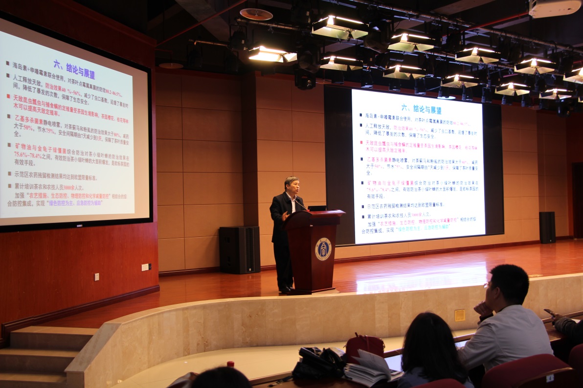 宋寶安院士以“茶樹病蟲害綠色防控及應用”為題作專題報告。宋院士介紹了我國茶樹上農藥登記及使用情況,以及貴州茶產業快速發展所面臨的挑戰;提出了一系列加強綠色植保技術應用、助推山地高效茶業發展的實踐策略,剖析了綠色植保對貴州茶葉品質的重要作用,并對未來中國茶業的發展表達了展望。