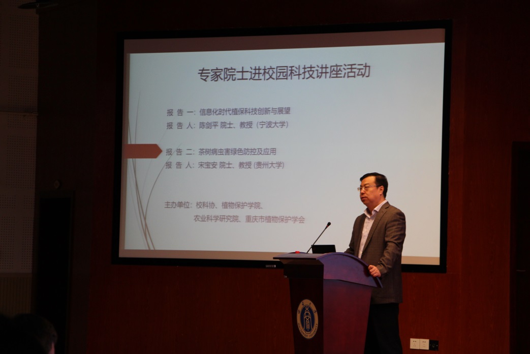 4月14日,由中國植物保護學會主辦、西南大學和重慶市植物保護學會承辦的“院士專家進校園活動”在校舉行。中國工程院陳劍平院士、宋寶安院士以及中國植物保護學會理事長陳萬權研究員等十余位專家蒞臨學校與師生面對面交流,近500名師生參加此次活動。學校副校長王進軍主持報告會。