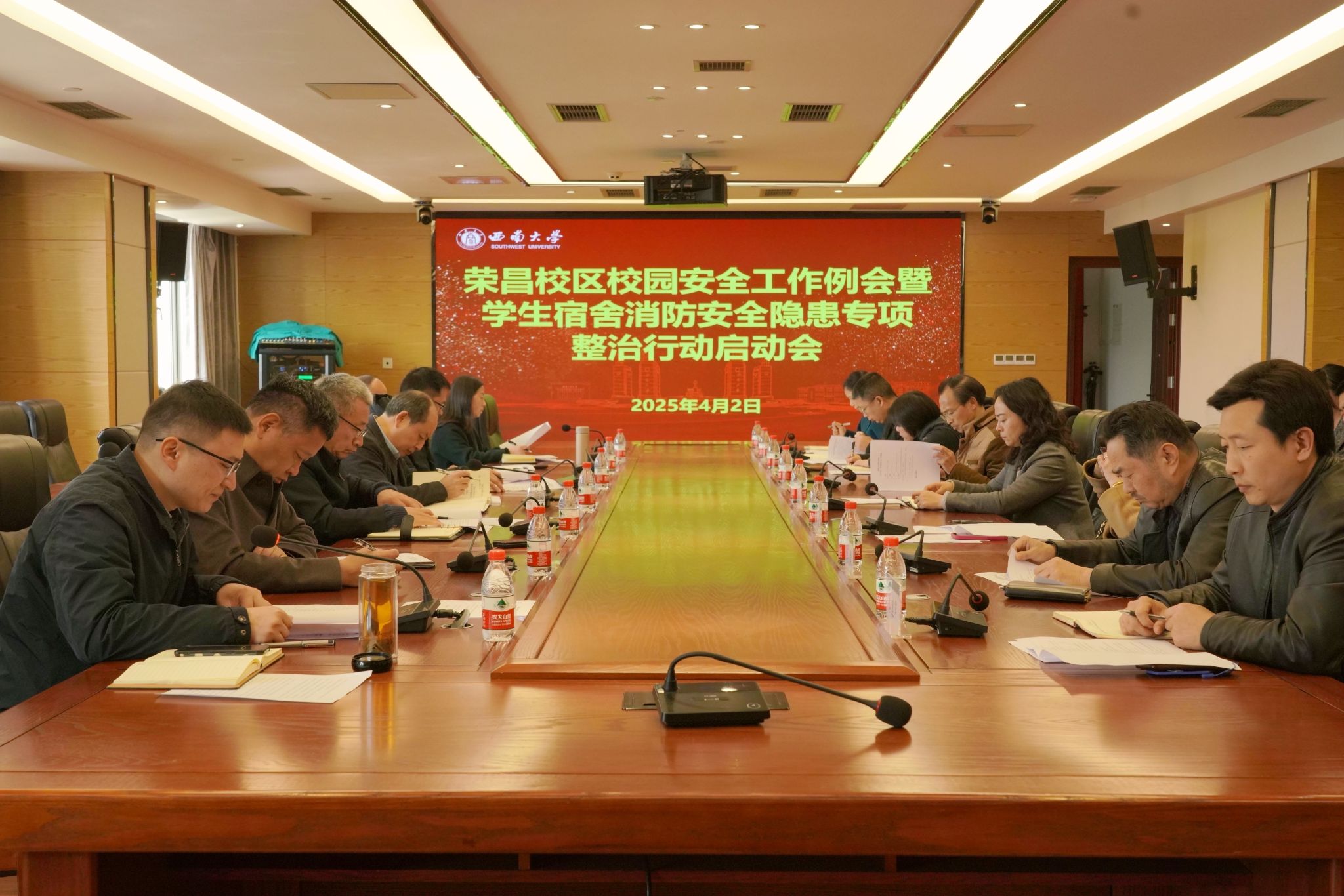 會議傳達了學校2025年安全穩定工作會議和3月校園安全工作例會精神,研究通過了《西南大學榮昌校區學生宿舍消防安全隱患整治專項行動方案》并正式啟動該項工作,要求專項行動各成員單位、工作組成員高度重視該項工作,按照方案任務分工把專項整治行動各項任務落實到位,確保專項整治行動取得實實在在的成效,共同筑牢學生宿舍消防安全防線。