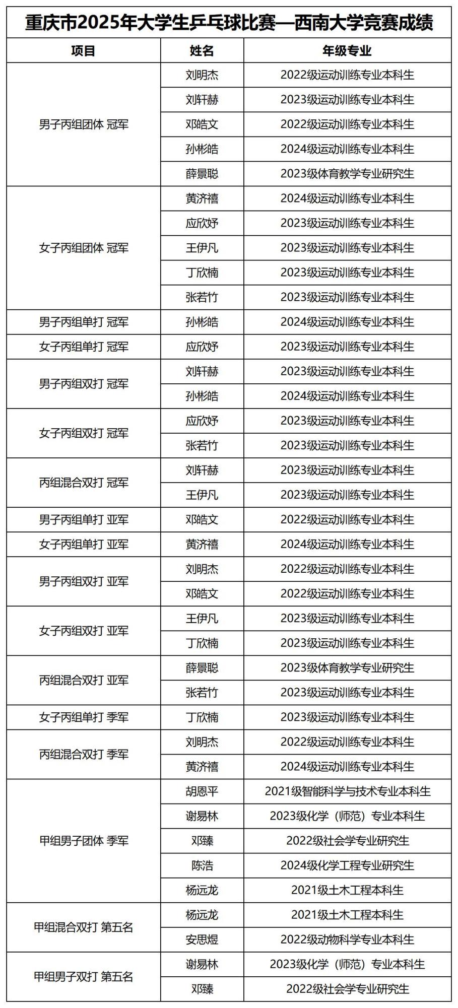 5月21日至25日,2025年重慶市大學生乒乓球比賽在重慶三峽醫藥高等專科學校體育館舉行。經過五天的激烈比拼,學校乒乓球代表隊以7金5銀3銅的優異成績領跑獎牌榜。丙組(體育專業學生組)選手包攬男子團體、女子團體雙料冠軍,并斬獲男單、女單、男雙、女雙、混雙全部五項單項比賽的冠亞軍。同時,甲組(本科院校普通學生組)選手首次挺進男子團體三甲行列,男雙、混雙項目雙雙闖入前五名。