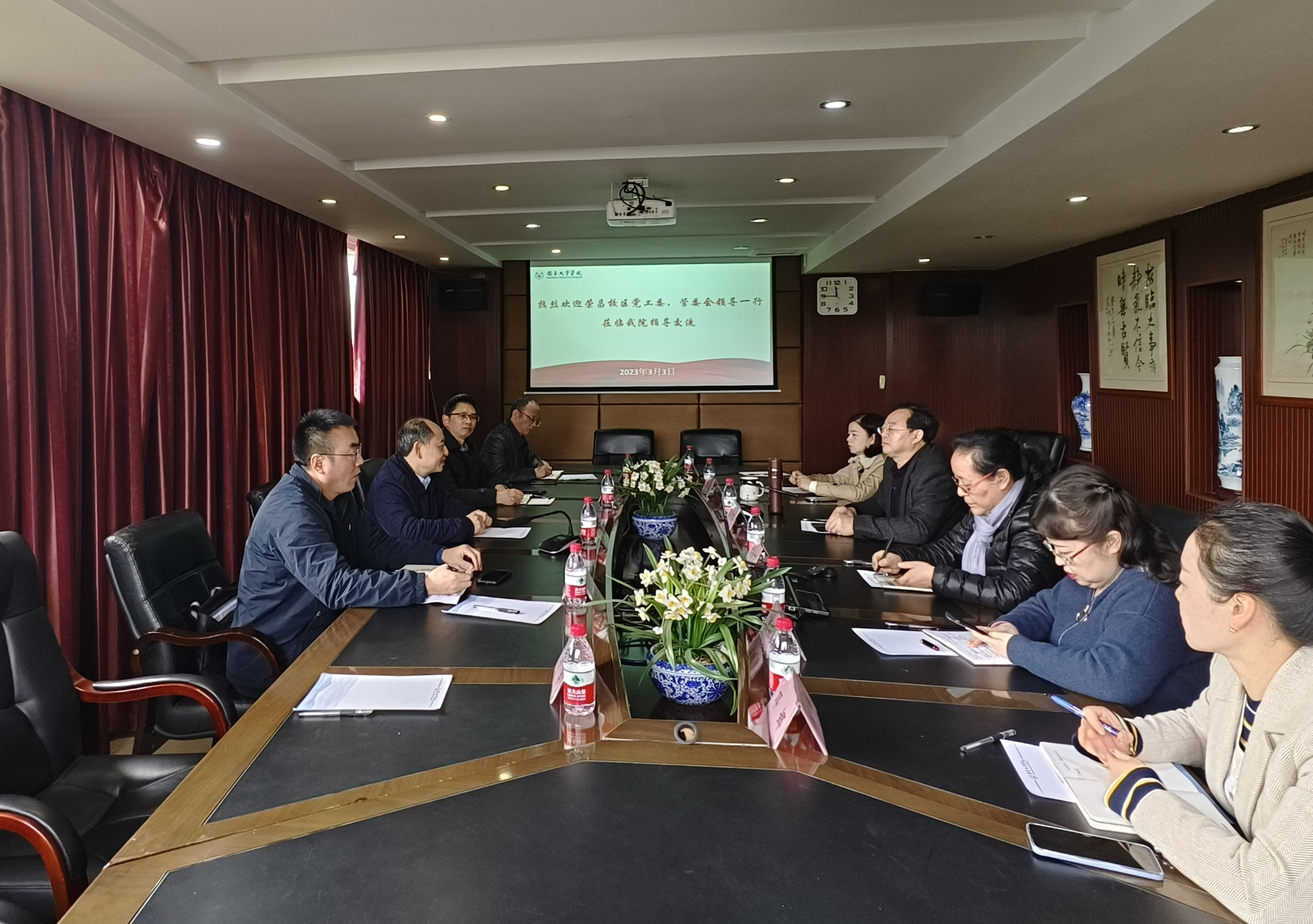 周國安對校區的人員情況、基礎條件及醫療需求進行了介紹,他講到,學校第三次黨代會提出了榮昌校區提質擴容的發展目標,在深化推進校區一體化管理過程中,相關部門做出了很多努力,學科專業調整、校園建設、干部交流等方面的工作成效顯著,其他多方面的工作也在穩步推進。此行的目的是希望與醫院進行深入交流,實質推進校區醫療條件改善工作。任元明副主任就分管校區醫療保障工作中遇到的困難和所做嘗試進行了說明,他提到,在三年疫情中,校區醫療條件的不足以及提升醫療條件的重要性日益凸顯,亟待制定切實可行的方案解決校區醫療保障問題。