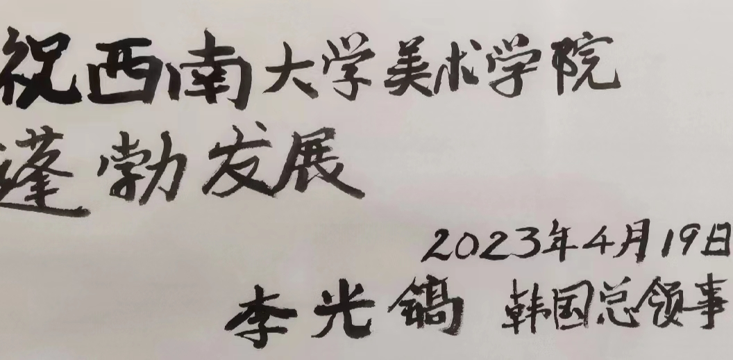 李光鎬總領事對學院師生近年來和韓國相關高校進行的深度學術交流表示肯定,并向學院在進一步加強中韓文化交流、做好藝術創新和加強人才聯合培養等方面提出殷切期望。同行領事和領館人員對學院在人才培養和文化傳播方面所做的工作表示高度認可。大家認為,西南大學美術學院文化底蘊深厚,人才培養扎實,學術成果豐碩,社會服務寬廣,在服務中韓文化交流、推動藝術學專業發展、打造世界知名專業院校發揮著重要作用。與會人員就教師訪學深造、研究生聯合培養、本科人才培養、文化藝術推廣、學術成果轉化和人才交流等方面進行了深入交流。李光鎬總領事提筆為學院寫下“祝西南大學美術學院蓬勃發展”,祝愿美術學院未來更美好。