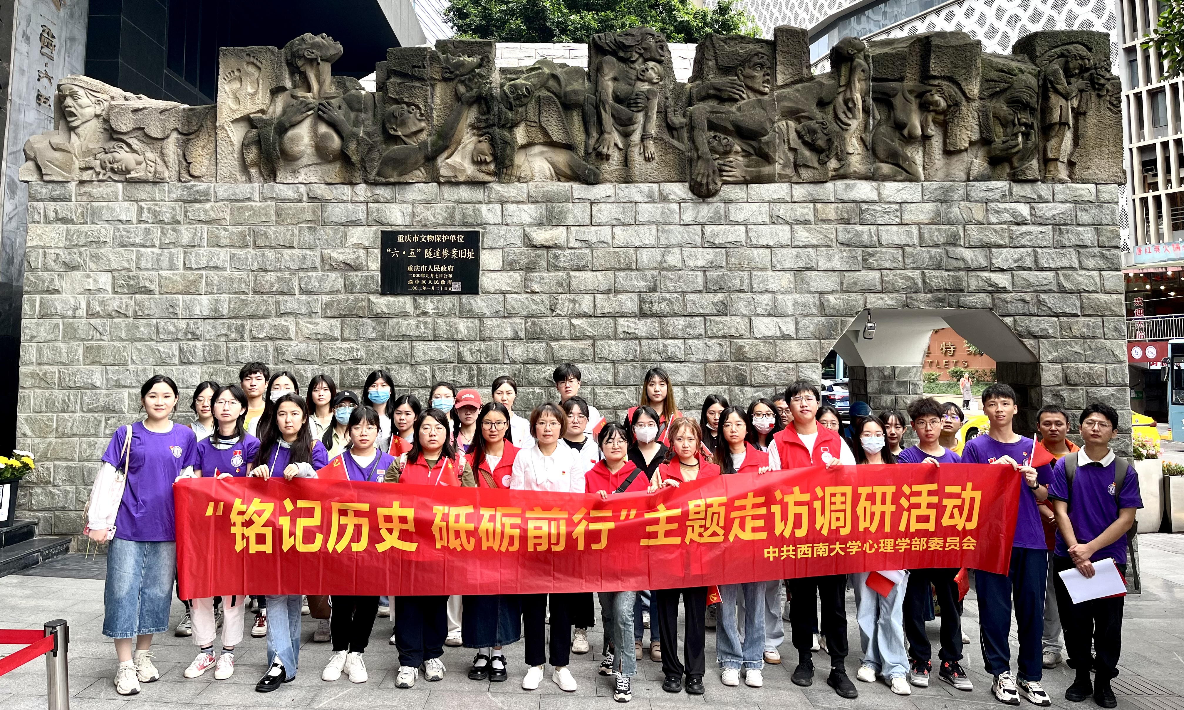 “歷史是最好的教科書,也是最好的清醒劑。”習近平總書記多次在重要場合提及要銘記歷史、珍愛和平。2023年6月5日,正值重慶大轟炸“六·五”大隧道慘案82周年紀念日之際,心理學部組織黨員學生赴“六·五”隧道慘案舊址開展主題教育走訪調研活動,深入群眾開展調查研究,提升民眾對“重慶大轟炸”的認知和關注度。