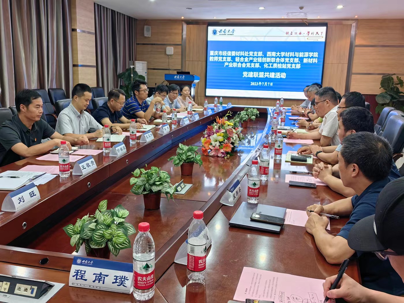 為深入開展學習貫徹習近平新時代中國特色社會主義思想主題教育,落實新時代黨的建設總要求,以高質量黨建推動政校行企深度合作交流,更好服務區域經濟社會發展,構建政校行企協同育人新格局,7月7日下午,材料與能源學院黨委與重慶市經濟和信息化委員會材料工業處黨支部、輕合金產業鏈創新聯合體黨支部、新材料產業聯合會黨支部、化工質檢站黨支部聯合開展“以學促干,政校行企共建謀發展”黨建聯盟共建活動。學院黨委書記梁武、院長徐茂文、副院長徐立群、副院長郭勝鋒、各科研團隊負責人、教師第一黨支部黨員,市經信委材料工業處處長兼支部書記張博、副處長李乾鋒、副處長夏正偉及支部黨員,新材料產業聯合會秘書長王敬貴,輕合金產業鏈創新聯合體秘書長劉旺,重慶化工質檢站站長兼支部書記王裕明、副站長席敏等30余人參加活動,活動由梁武主持。
