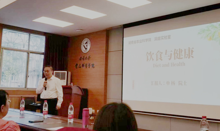 9月22日上午,食品科學學院和科學技術協會聯合主辦的含弘講壇邀請到了中國工程院院士、湖南省農業科學院學術委員會主任、湖南省洞庭實驗室主任單楊研究員。單楊院士以“飲食與健康”為題展開了精彩報告,并親切地與現場師生進行交流。報告會由副校長趙國華教授主持。
