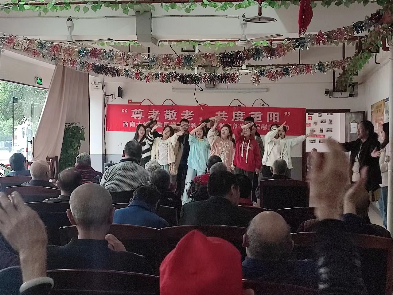 活動伊始,學(xué)生黨員們?yōu)槔先藗儙砹司臏?zhǔn)備好的文藝表演,帶動了現(xiàn)場的歡樂氣氛。學(xué)生黨員們?yōu)槔先藗儙砹税藗€活力滿滿的節(jié)目,現(xiàn)場掌聲連連;最后在學(xué)生們的帶領(lǐng)下,大家一起合唱了歌曲《我和我的祖國》,現(xiàn)場氣氛達(dá)到高點(diǎn)。臺上臺下同學(xué)們與老人積極互動,傾聽他們的往事,了解他們當(dāng)下的生活。活動尾聲,大家為老人們送上節(jié)日祝福和佳節(jié)禮物,傳遞真情,歡聲笑語,溫暖重重。