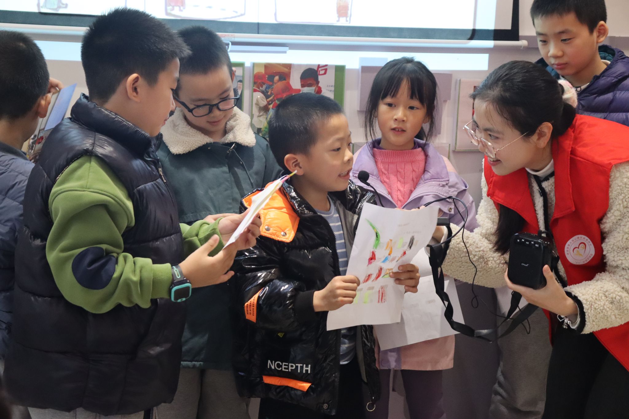 在認識不同情緒之后,志愿者帶領小朋友們進行“房樹人”心理繪畫測驗,并為每位小朋友的畫作進行分析。在志愿者的積極關注和鼓勵下,小朋友們在充滿信任、溫暖、理解的氛圍中真實地開放自己,與志愿者分享自己的作品,體會繪畫背后的含義。通過這一環節,搭建起通往兒童內心世界的橋梁,及時關注到兒童的心理狀況,以提供個性化的心理健康指導。