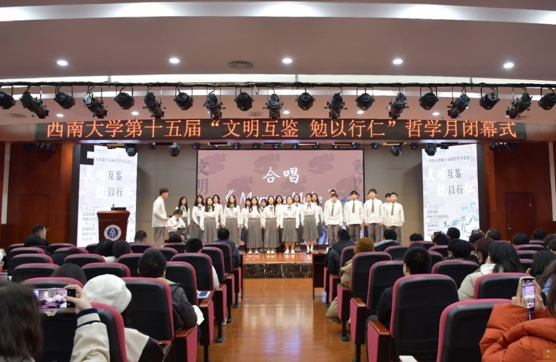 12月22日晚19:00,西南大學第十五屆“文明互鑒·勉以行仁”哲學月閉幕式在校博物館4樓報告廳隆重舉行。華南師范大學特聘教授肖顯靜、校社科處副處長王作軍、學生處助學中心主任孫金春、博物館副館長譚志敏、國家治理學院副院長郭美云、張永紅、何健以及全校師生200余人參加了閉幕式。