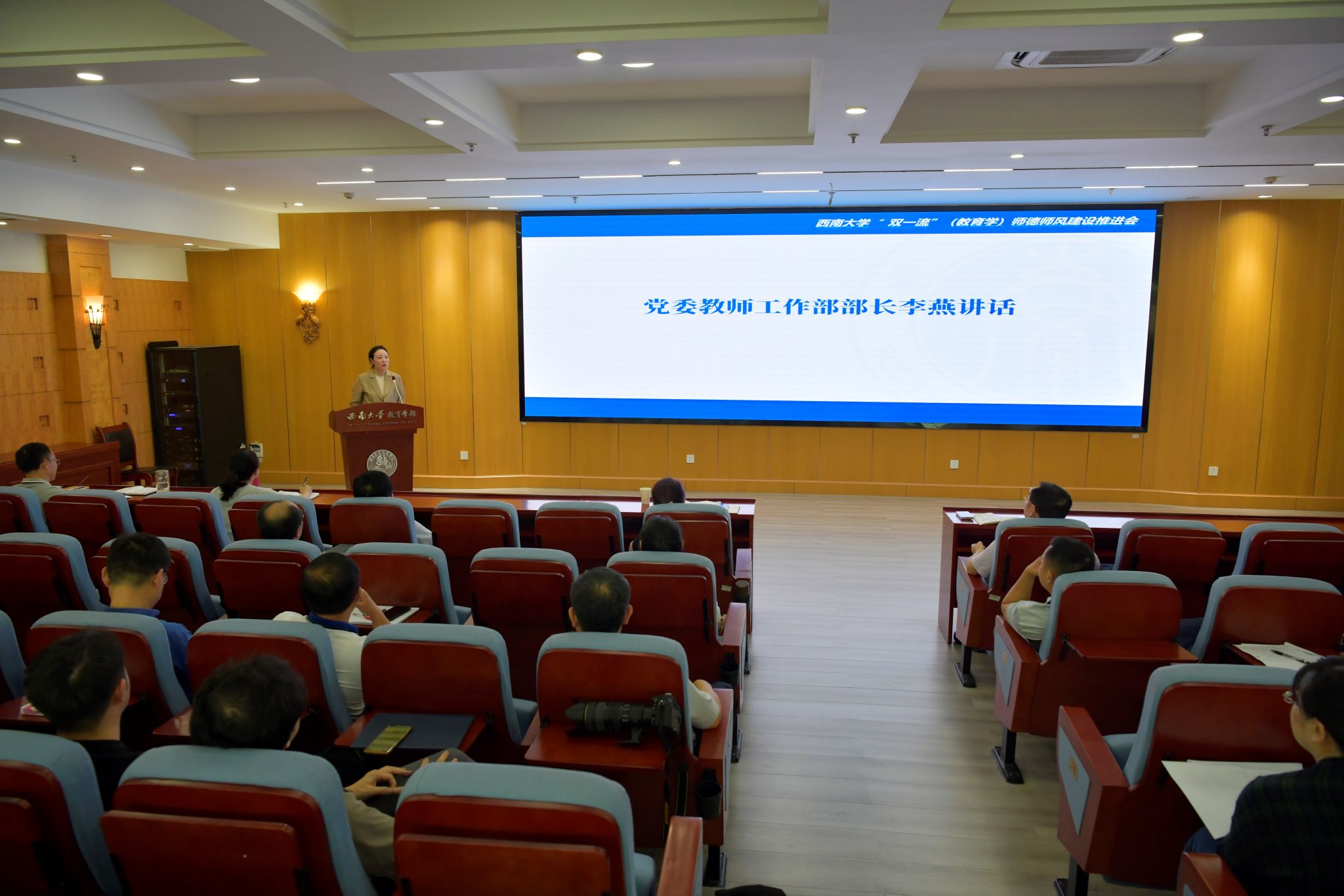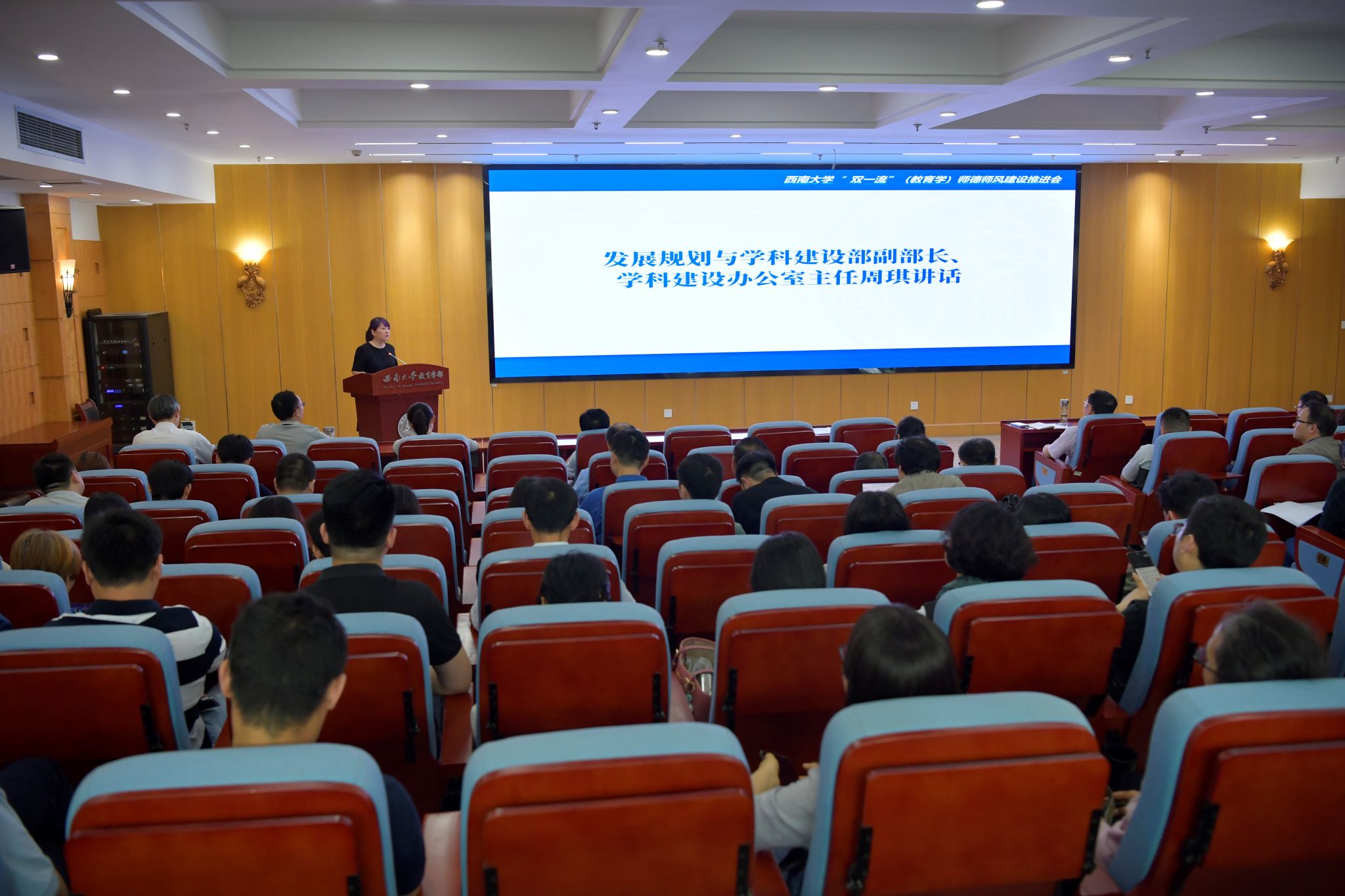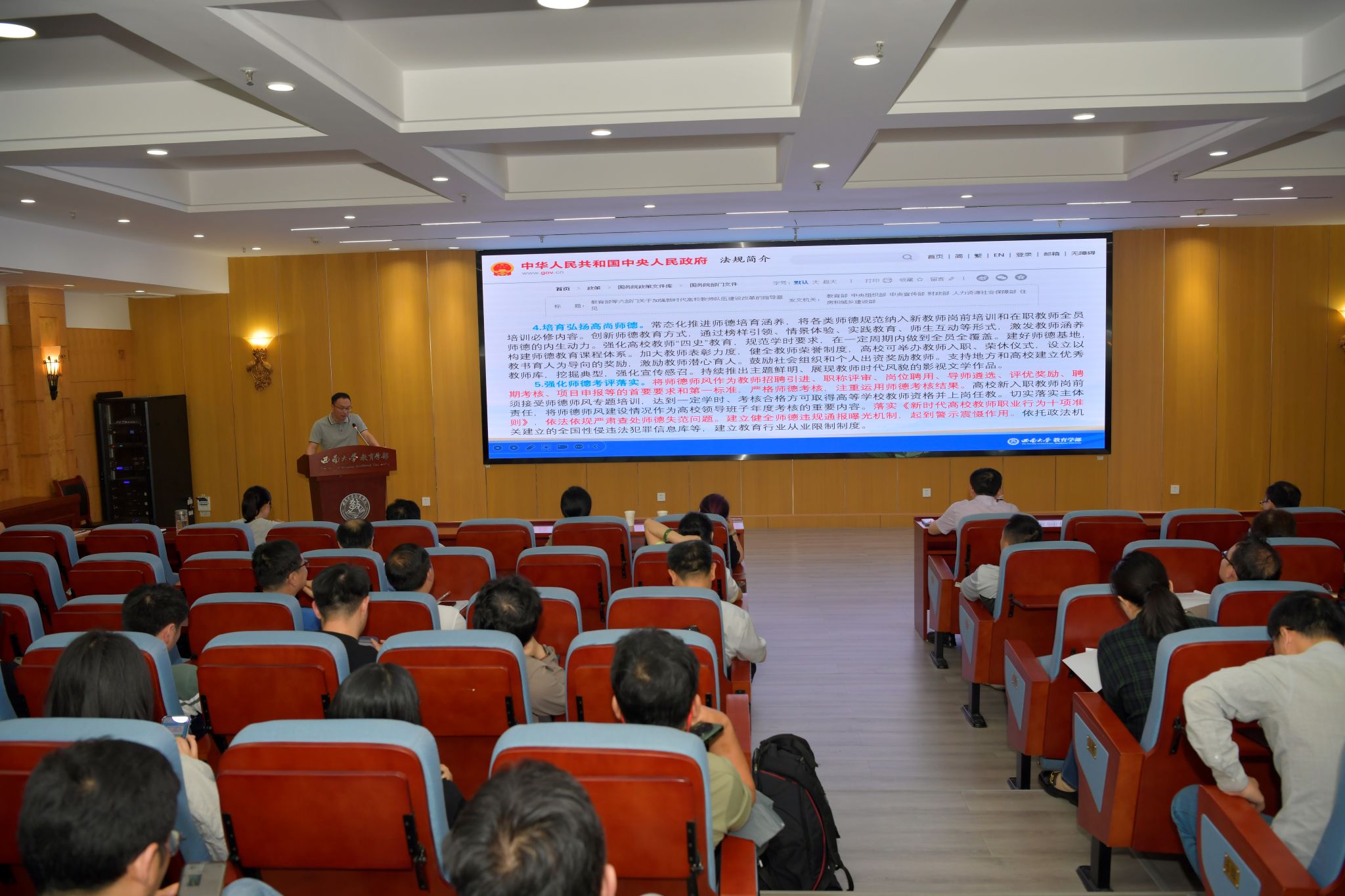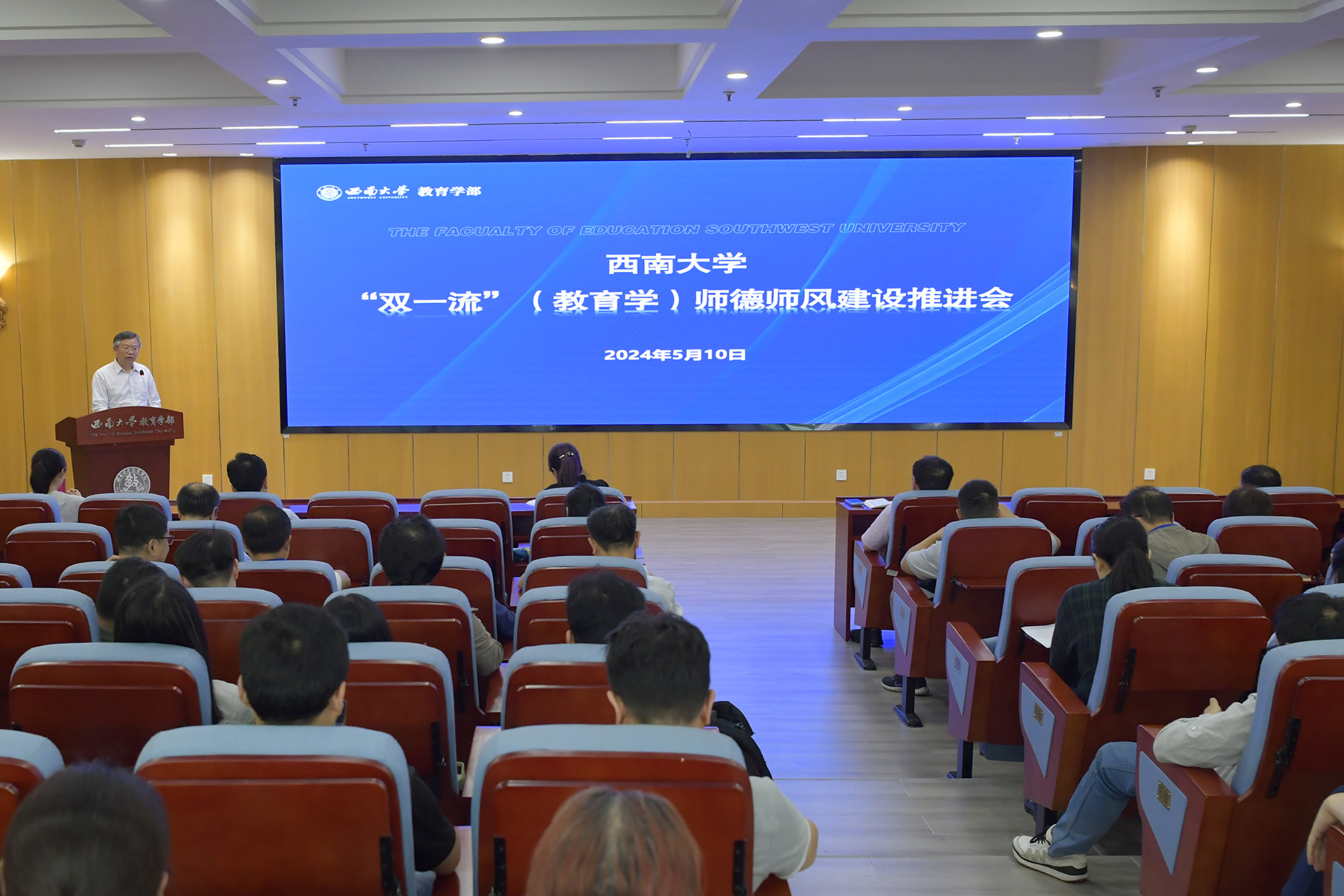 5月10日下午,西南大學“雙一流”(教育學)師德師風建設推進會在教育學部802報告廳順利召開。學校黨委教師工作部部長李燕,發展規劃與學科建設部副部長、學科建設辦公室主任周琪,教育學部全體班子成員和教育學部、西南民族教育與心理研究中心教職工參加會議。會議由學部黨委書記周文全主持。