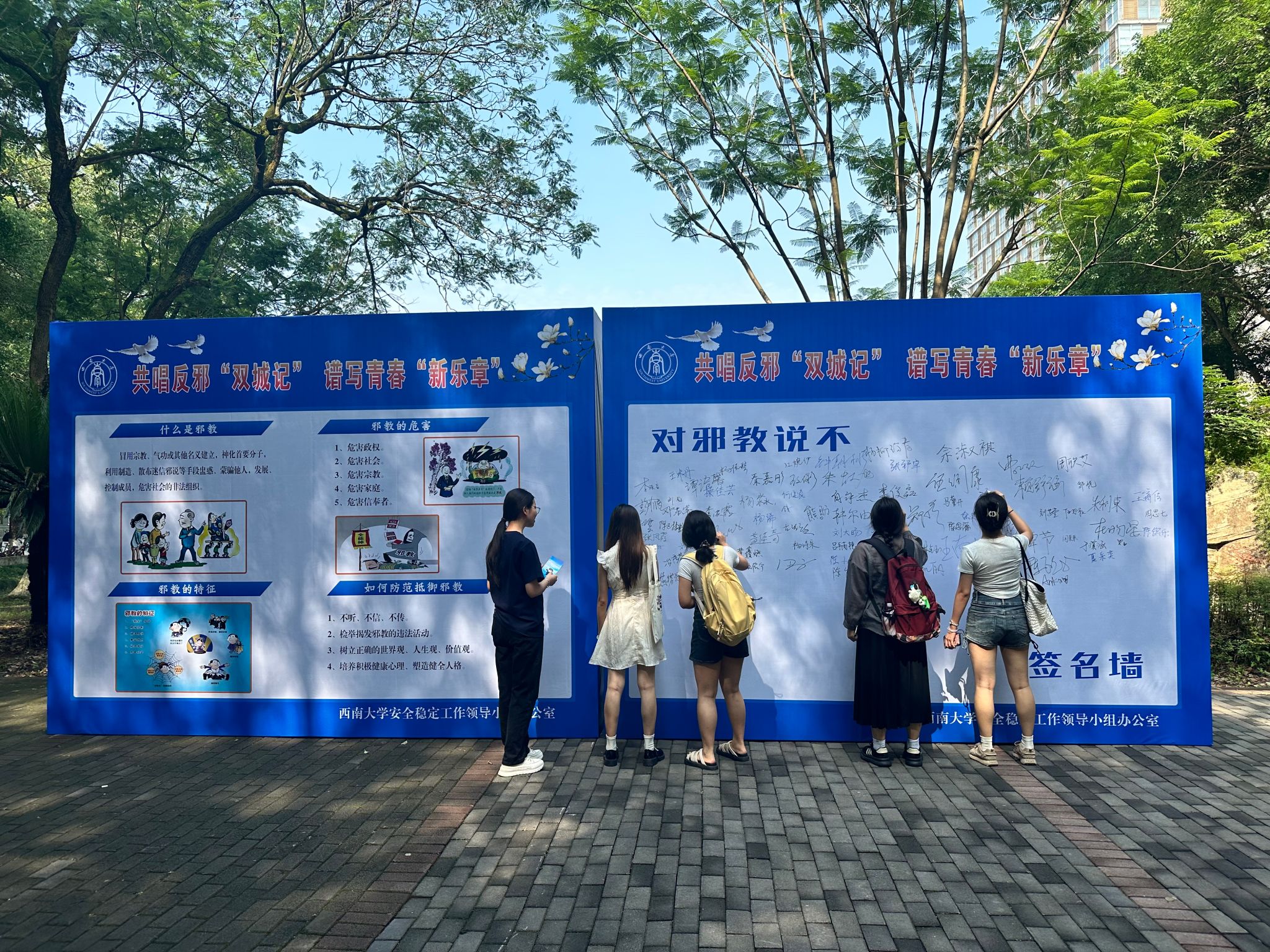 6月12日上午,學(xué)校保衛(wèi)處組織開展了“對邪教說不”線下簽名活動。現(xiàn)場工作人員向參與活動的師生詳細講解了反邪教相關(guān)知識,同學(xué)們在反邪教簽名墻上,以簽名為承諾,以反對邪教為己任,自覺遠離邪教,堅決做到不聽、不信、不傳、不參與。活動現(xiàn)場氣氛濃厚,吸引了近千名師生積極參與,紛紛表示要做校園反邪衛(wèi)士。