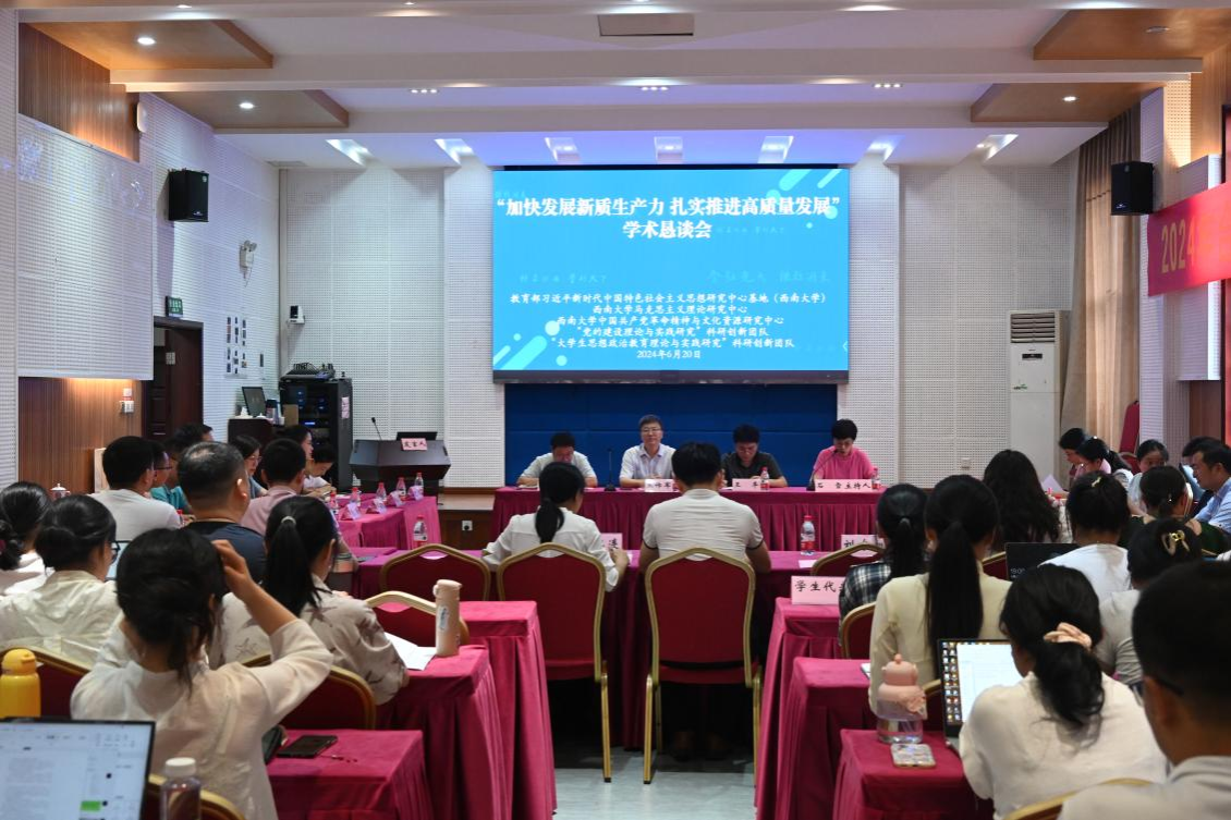 6月20日,由黃蓉生教授領銜的“三中心兩團隊”共同主辦的“加快發展新質生產力 扎實推進高質量發展”學術懇談會在馬克思主義學院舉行。社科處副處長王作軍、馬克思主義學院副院長王豐、唐斌出席懇談會。各主辦單位成員及學院研究生代表參加。