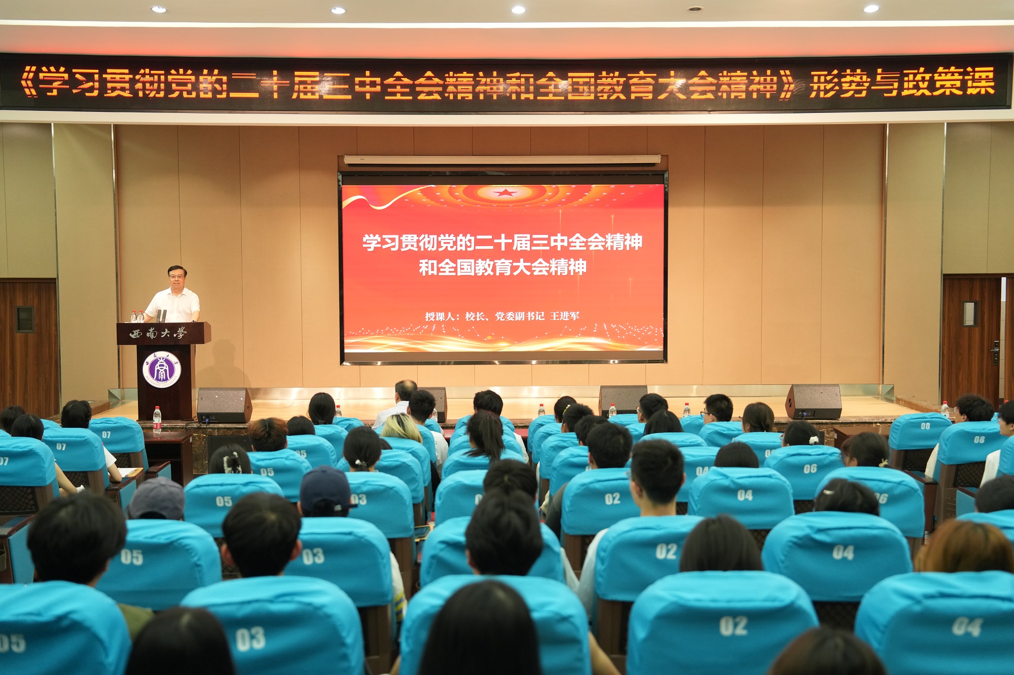 王進軍的講授從深入學習領會習近平總書記在黨的二十屆三中全會上的重要講話精神、全面準確理解《決定》提出的進一步全面深化改革重大舉措以及習近平總書記在全國教育大會上的講話深刻闡釋了教育強國的科學內涵和基本路徑、深刻闡述了教育強國建設要正確處理好的重大關系、系統部署了全面推進教育強國建設的戰略任務和重大舉措等方面內容展開,進一步明確提出“教育強國、西大何為”的目標、任務和舉措路徑。他強調,要把學習貫徹黨的二十屆三中全會和全國教育大會精神同學習貫徹習近平總書記視察重慶重要講話重要指示精神結合起來,深學篤行習近平總書記關于全面深化改革的一系列新思想、新觀點、新論斷,高舉改革旗幟,凝聚改革合力,直面問題攻堅克難,敢為人先大膽探索,唯實爭先狠抓落實,以進一步全面深化改革的實干實績實效奮力譜寫加快建設教育強國的西大答卷!