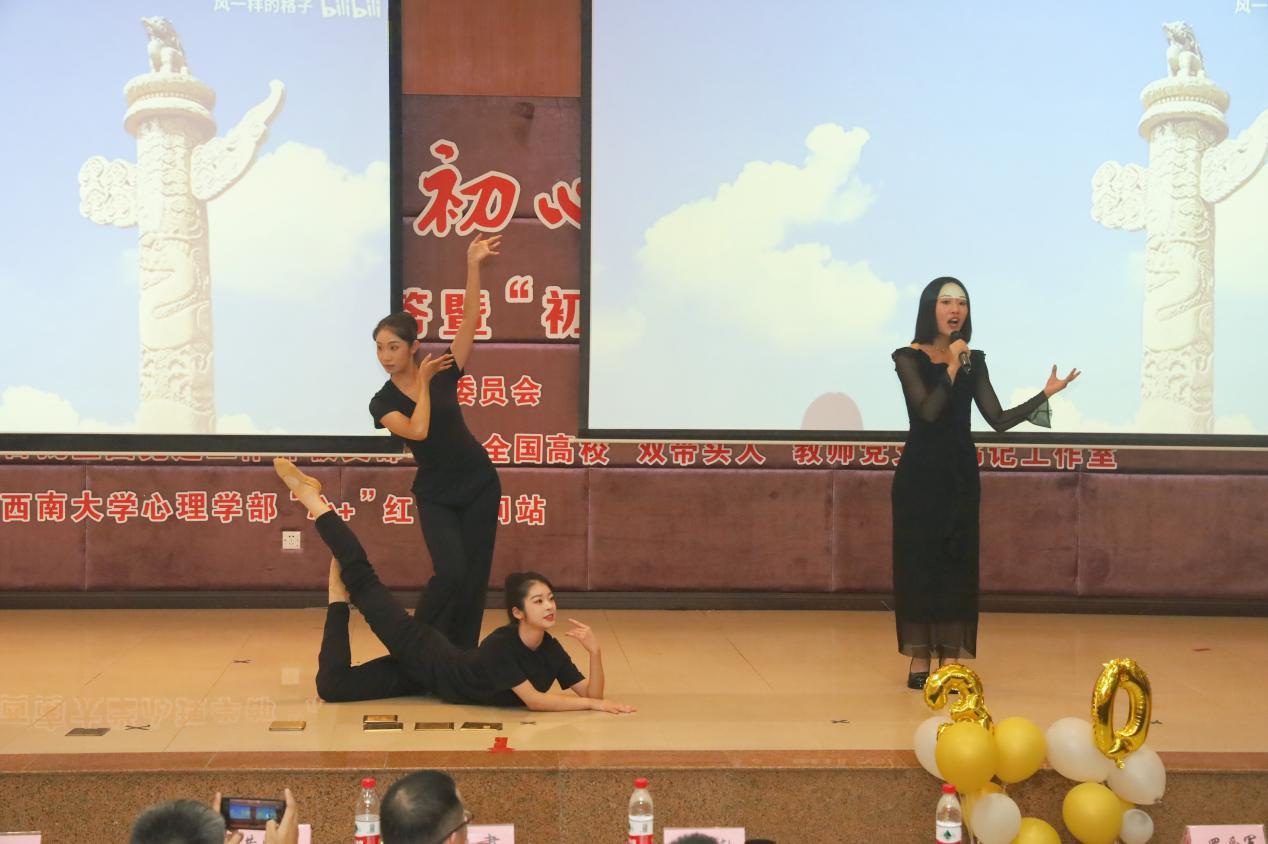 “初心”劇場展演同樣精彩紛呈。首批全國黨建工作樣板支部、首批全國高校“雙帶頭人”教師黨支部書記工作室——心理學部教師第一黨支部特別出演“圓桌心理劇”《不忘教育初心,傳遞智慧火種——論如何將教育家精神融入教學、科研和社會服務》,拉開了“初心”劇場賽道的序幕。在之后“群星閃耀”的“初心”劇場里,9支隊伍陸續上場,用激昂嘹亮的歌聲、靈動優美的舞蹈、聲情并茂的朗誦、活靈活現的表演,抒發對革命先驅和創業先輩的崇高敬意,表達對新中國成立75周年、心理學部建系30周年的熱烈祝賀。