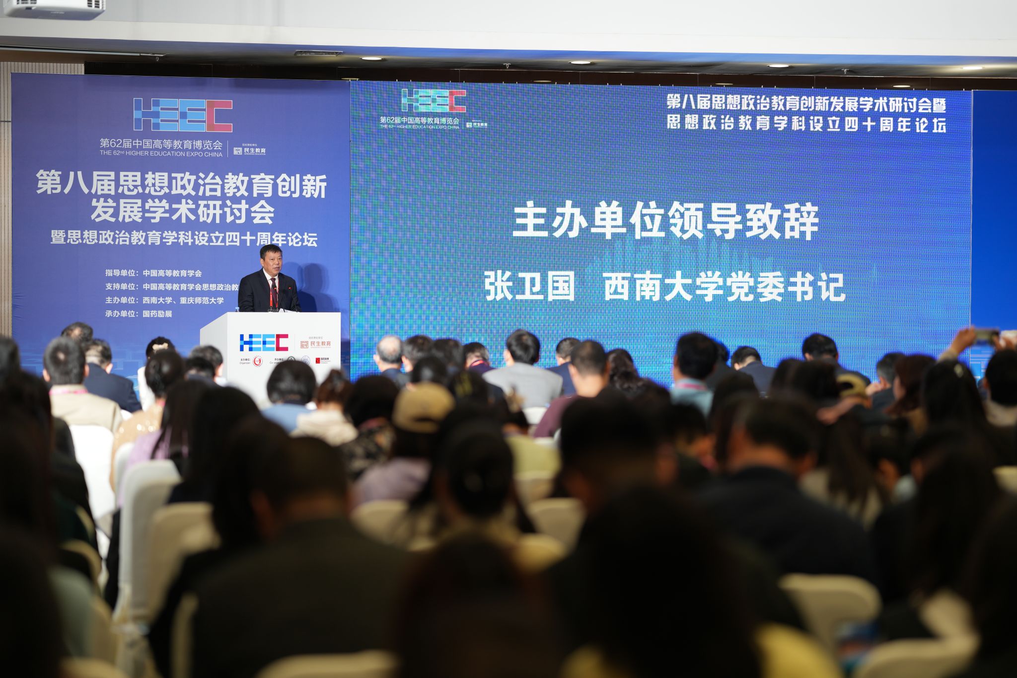 11月15日,第62屆中國高等教育博覽會在重慶開幕,學校參展并主辦、承辦多場系列活動。作為博覽會同期學術活動之一的第八屆思想政治教育創新發展學術研討會暨思想政治教育學科設立四十周年論壇于當日同步舉行。本次會議在教育部思想政治工作司、中國高等教育學會的指導和中國高等教育學會思想政治教育分會支持下,由學校和重慶師范大學共同主辦,來自國內各大高校的300余名專家學者齊聚一堂共享思想政治教育學科建設成效、展望學科發展未來路向。