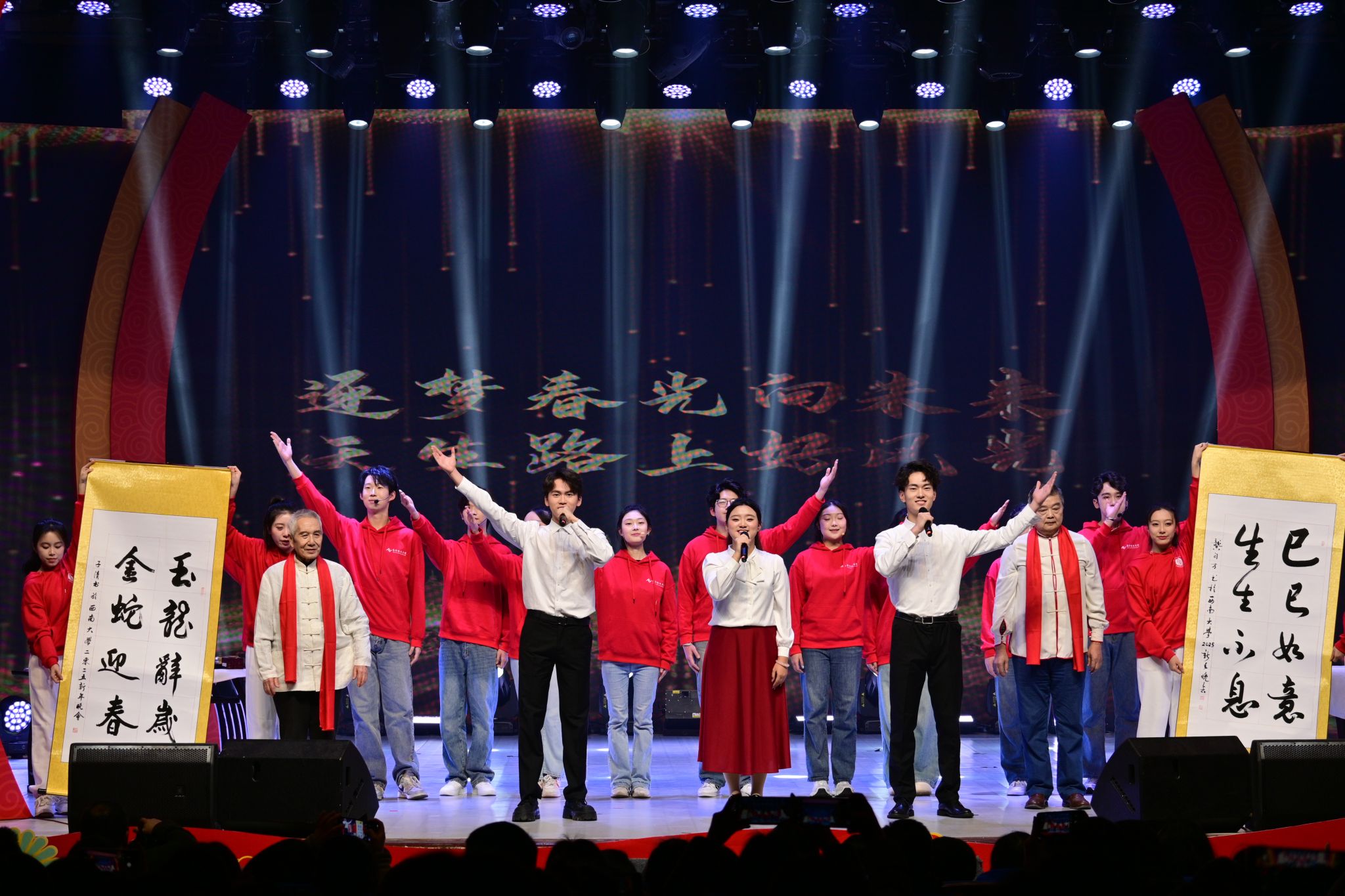 第四篇章“一路向陽”以新聞傳播學院和離退休工作處帶來的詩朗誦《天生路上》開場,學子們鏗鏘有力的字句間,謳歌著代代西大人與祖國同呼吸、與時代共奮進的使命擔當;文學院退休教師許子清、教育學部退休教師龔自芳揮毫潑墨,祝愿廣大師生“玉龍辭歲,金蛇迎春”“巳巳如意,生生不息”。緊隨其后的民族歌曲聯唱風情十足,《裕固族姑娘就是我》《新疆好》《贊歌》《紅太陽照邊疆》四首歌曲喜氣洋洋,繪就了一幅民族團結的生動畫卷。最后,音樂學院帶來的舞蹈《金蛇狂舞》頃刻點燃全場,紅色的身影翻轉跳動、金色的飄帶翻騰揮舞,觀眾的掌聲此起彼伏,伴隨著師生們對新年的美好祝愿,晚會落下帷幕。