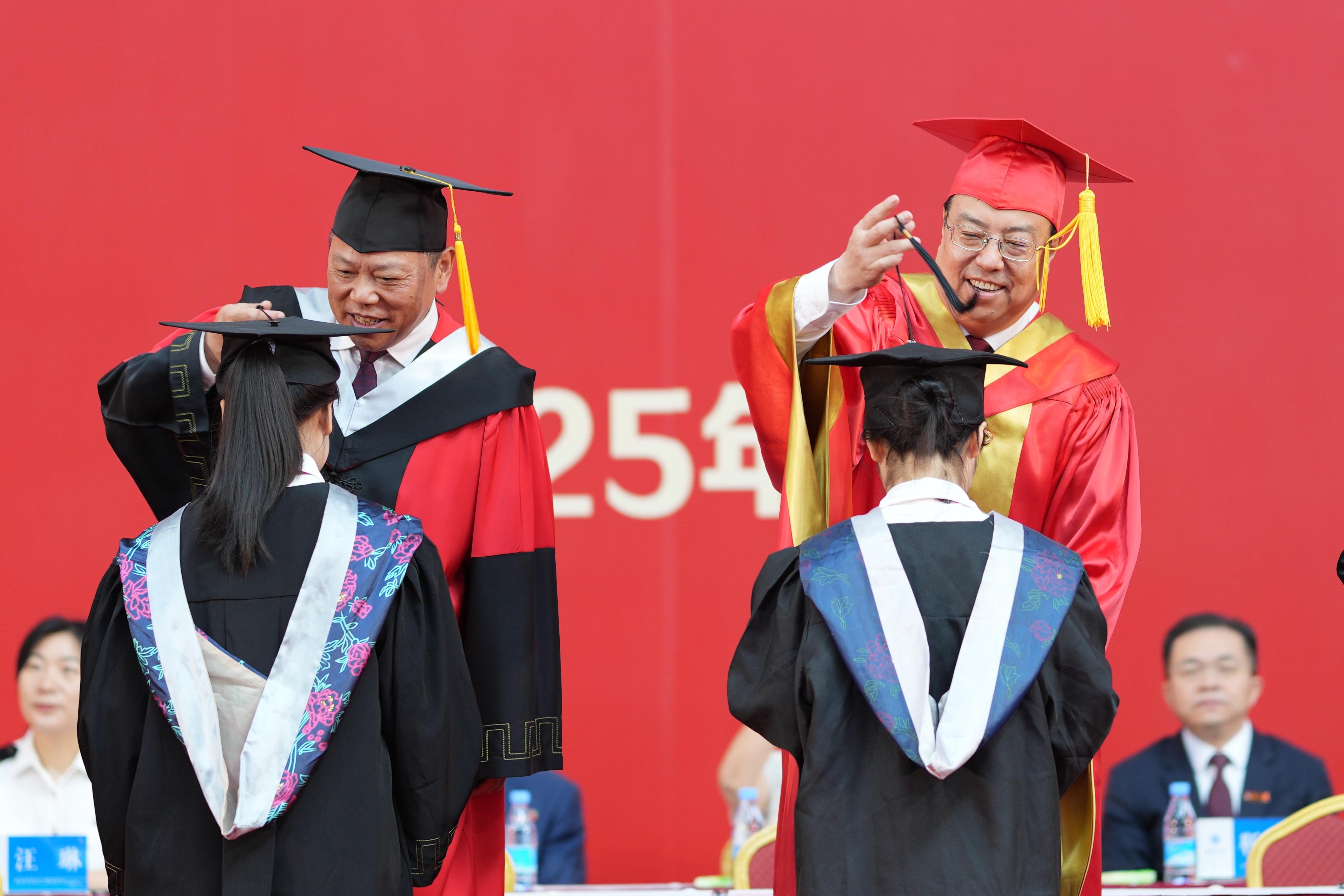 全體在校校領(lǐng)導(dǎo)、黨委常委、校長助理、校學(xué)位評(píng)定委員會(huì)委員、學(xué)生工作領(lǐng)導(dǎo)小組成員單位負(fù)責(zé)人、教師代表、校友代表、各學(xué)院(部)負(fù)責(zé)人、全體畢業(yè)生輔導(dǎo)員、班主任代表、2025屆全體本科畢業(yè)生和部分畢業(yè)生家長共同參加。典禮暨授位儀式由校黨委副書記黃杰主持。